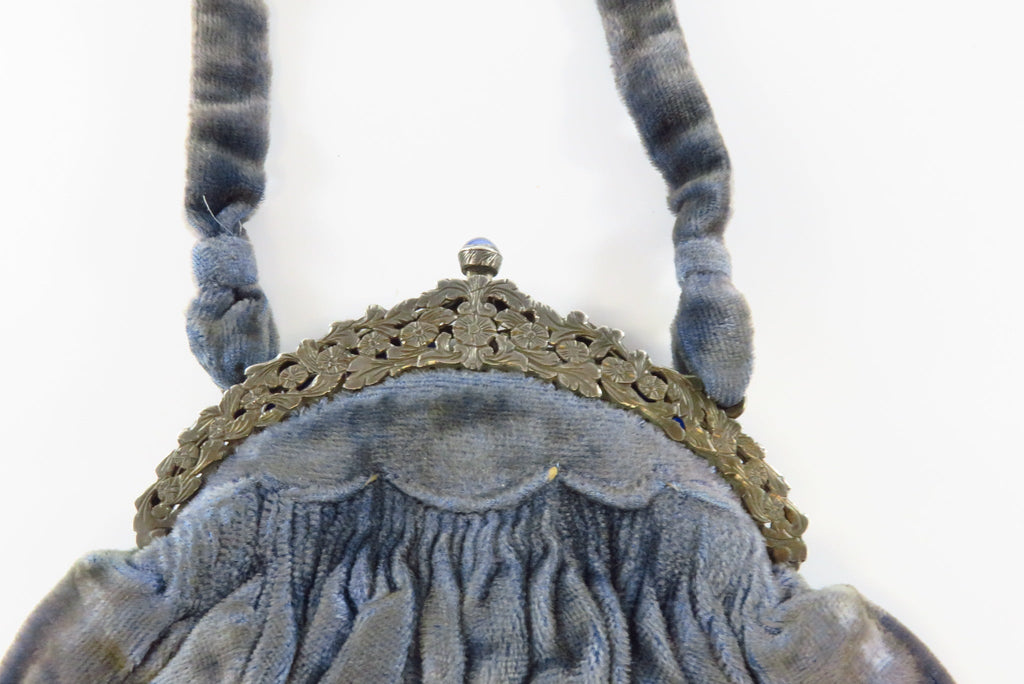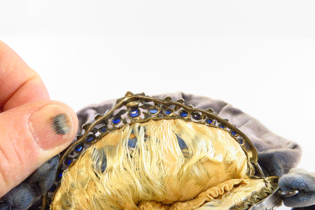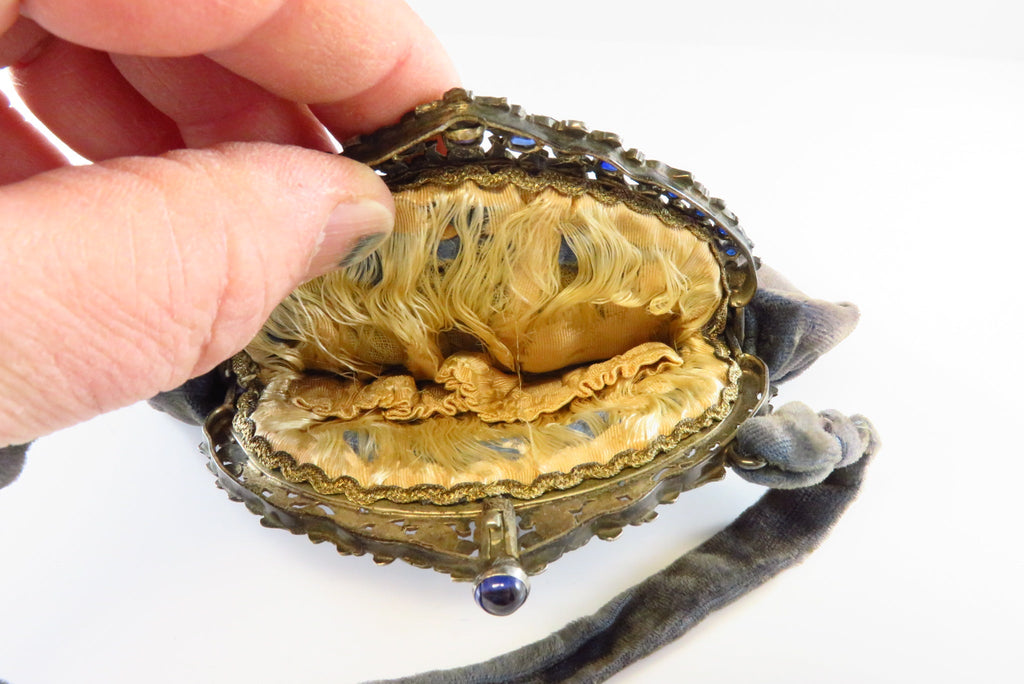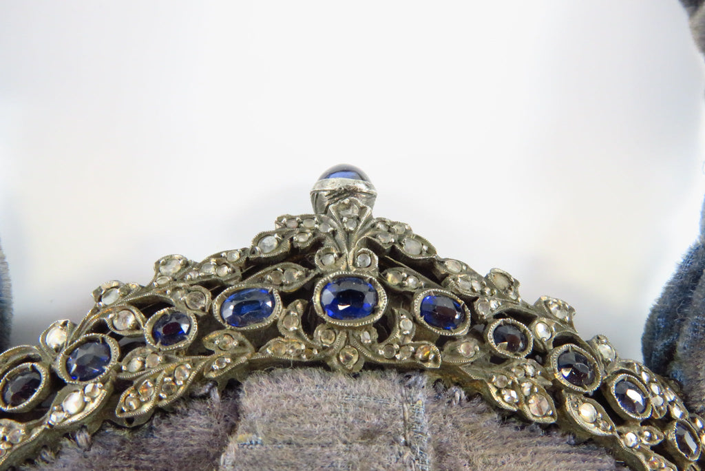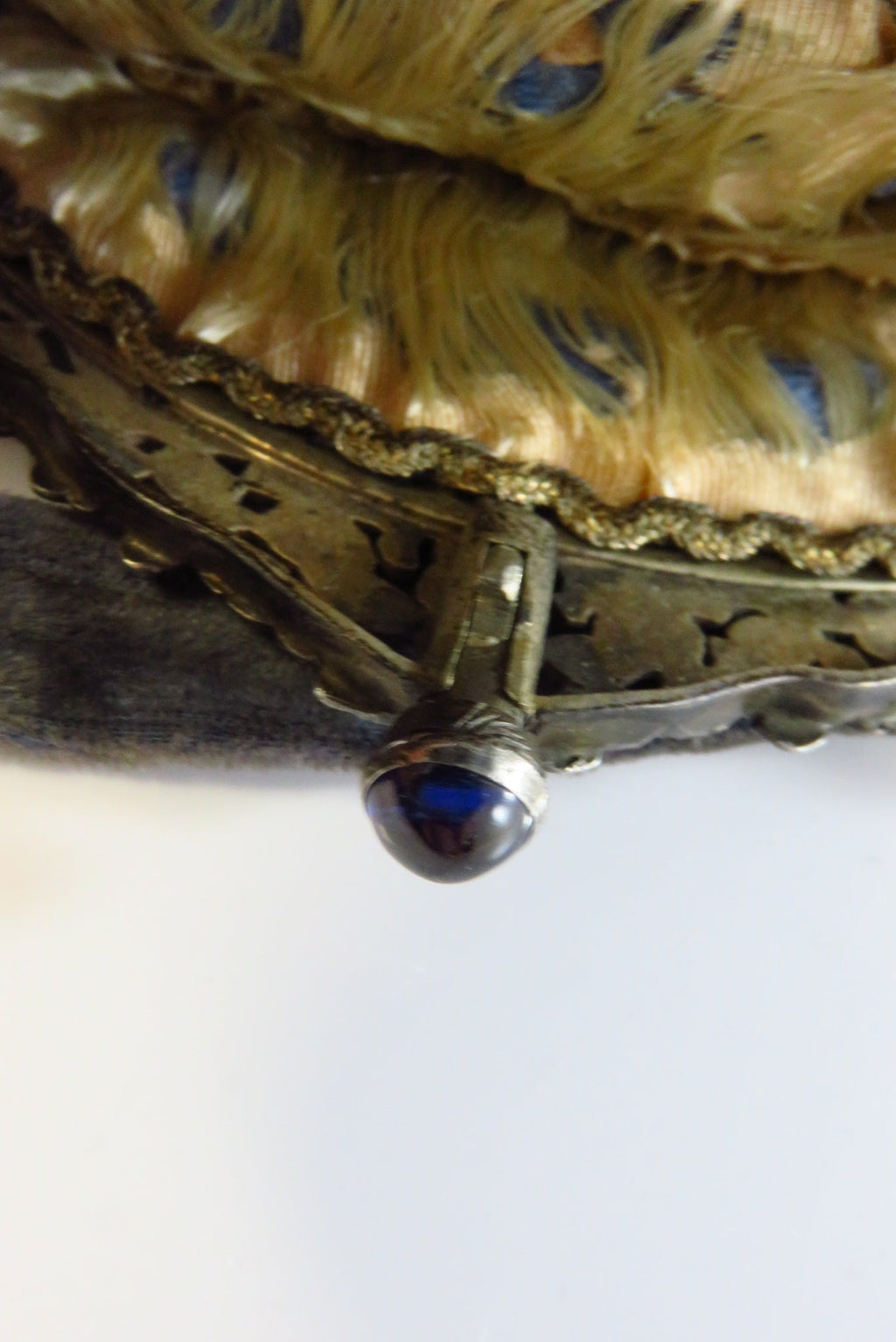 Antique Coin Silver Diamond & Sapphire Victorian Style Velvet Hand Bag