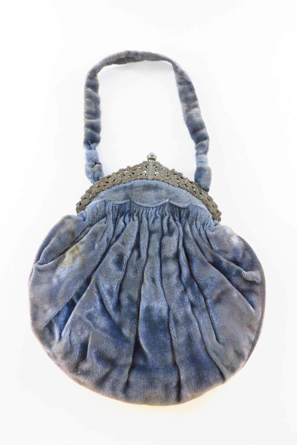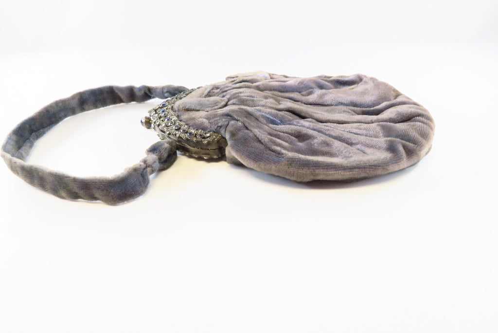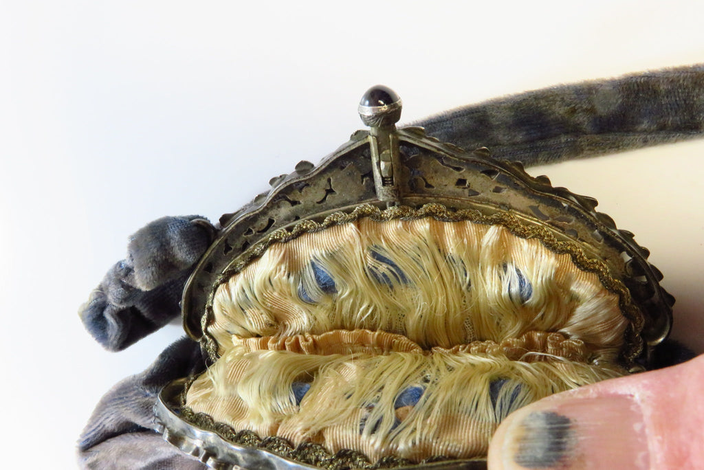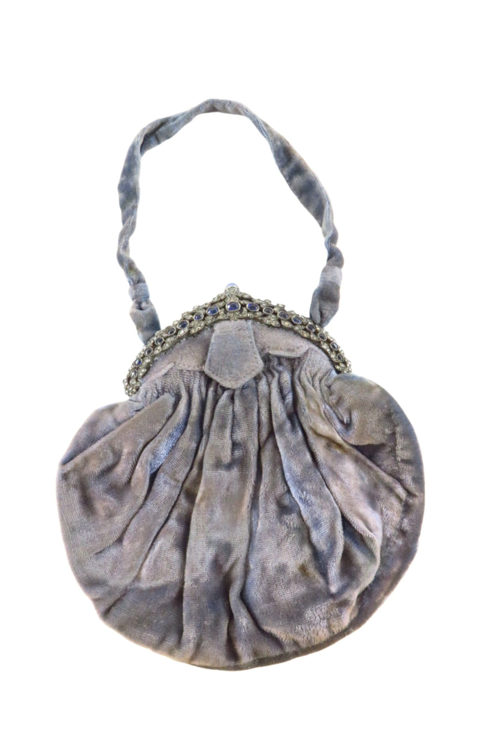 Antique Coin Silver Diamond & Sapphire Victorian Style Velvet Hand Bag