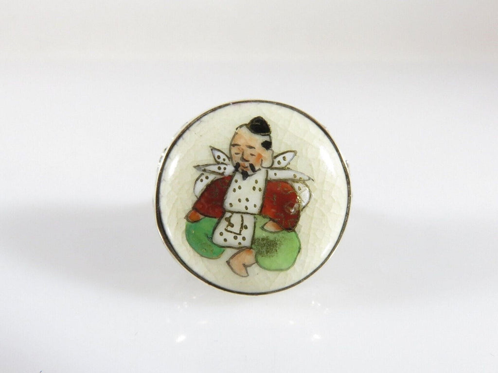 Japanese Satsuma Deity God of Fortune Hand Painted Button Ring Sterling