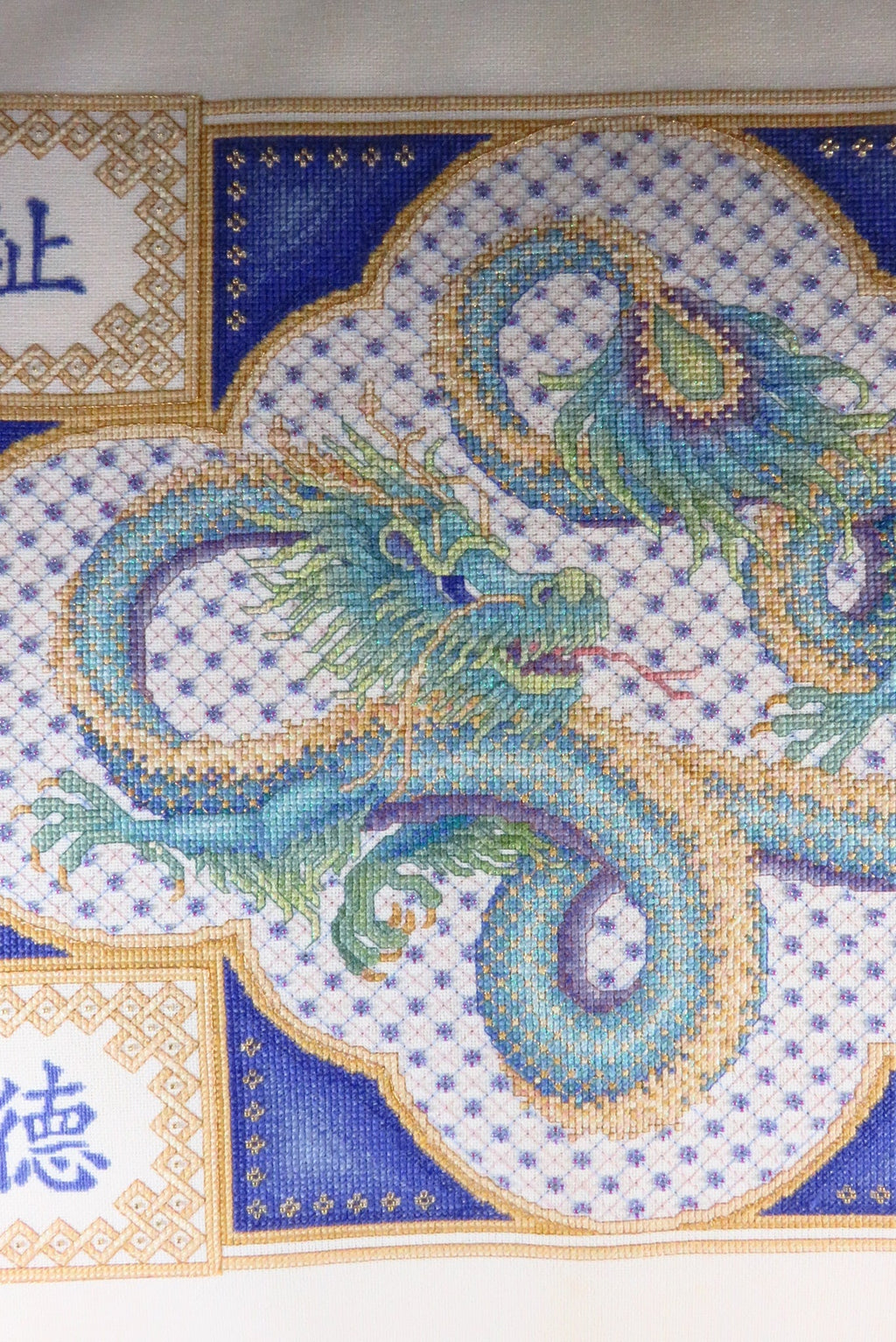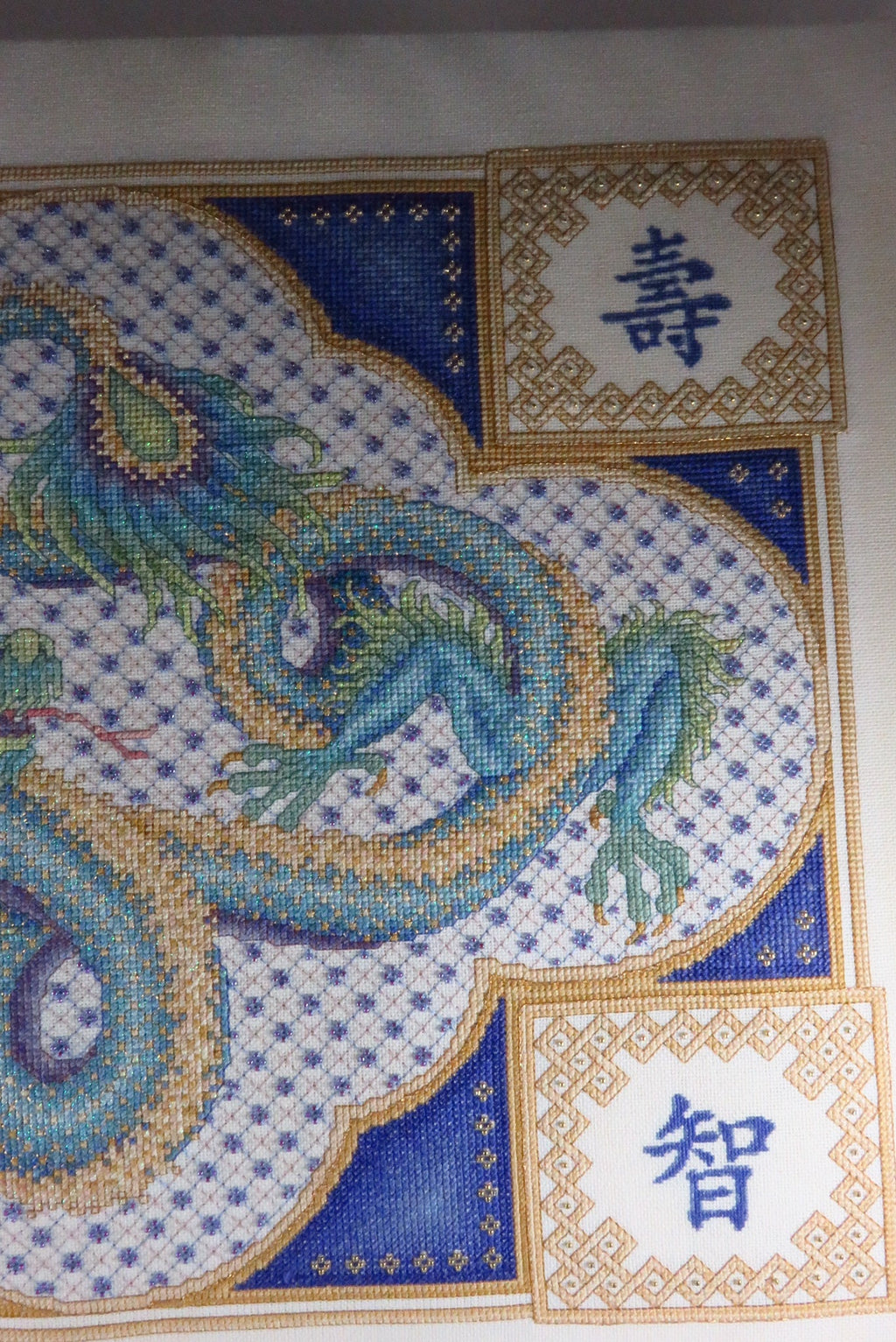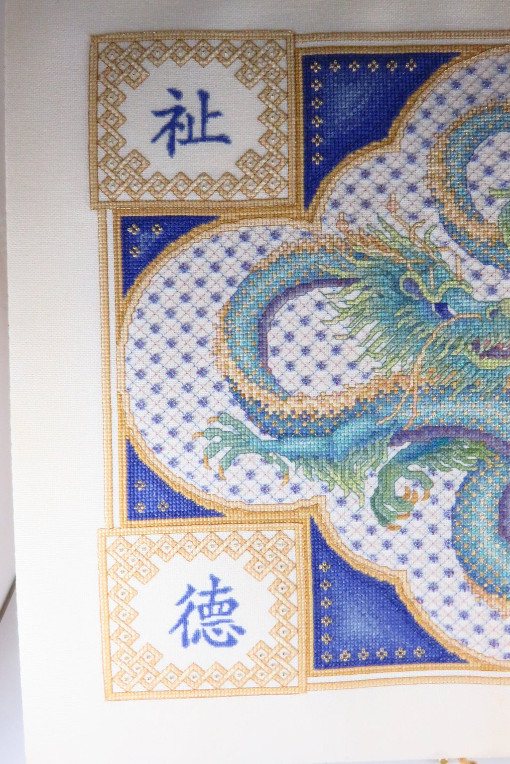 Longevity Virtue Happiness Wisdom Handmade Dragon Needlepoint Art
