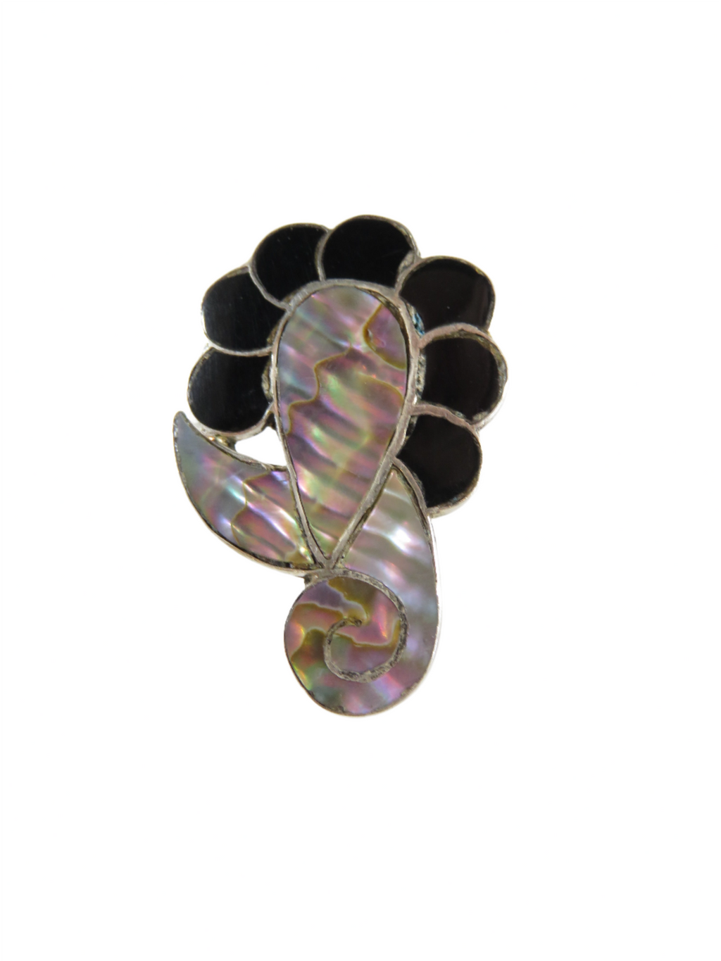 Vintage Circa 1940's unmatched single screw back large free form abstract sterling earring inlaid with onyx and abalone. I believe this may predate the eagle mark as it is stamped separately as Mexico. Front is sterling, the screw back portion of the earring is either brass or alpaca. Unpolished and unmolested just in need of missing mate so selling as a replacement earring if you happen to have one of these that's gone missing or make a unique finger ring out of this beauty!