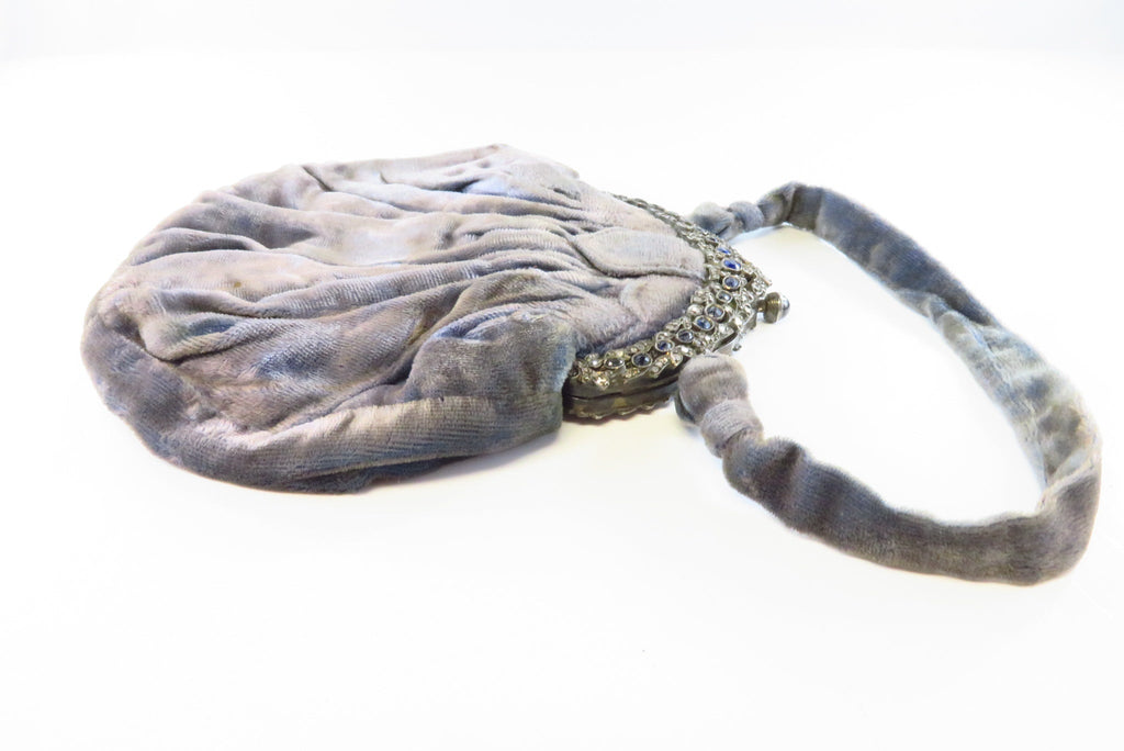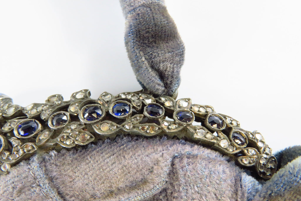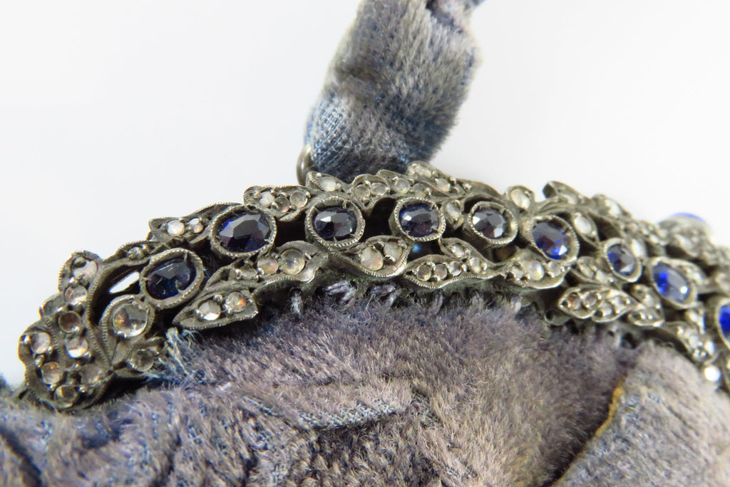 Antique Coin Silver Diamond & Sapphire Victorian Style Velvet Hand Bag
