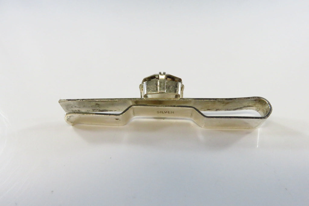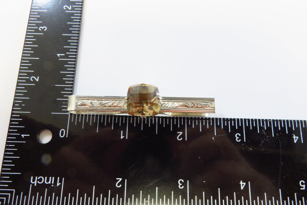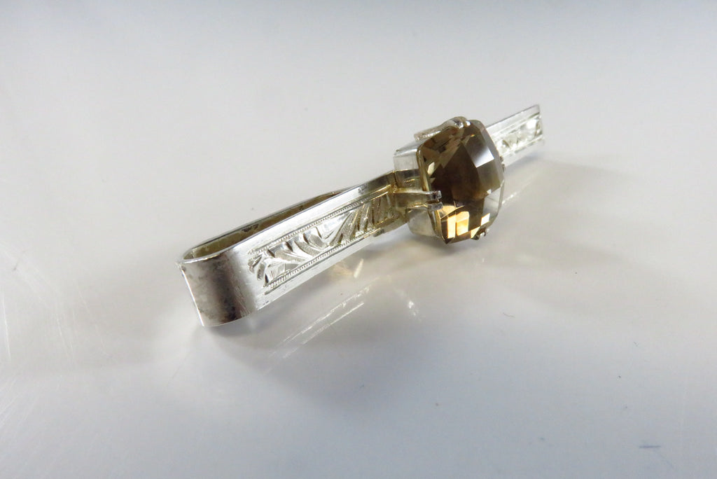 Fancy Etched Silver Tie Bar Clip with Large Smoky Quartz Accent Mid Century
