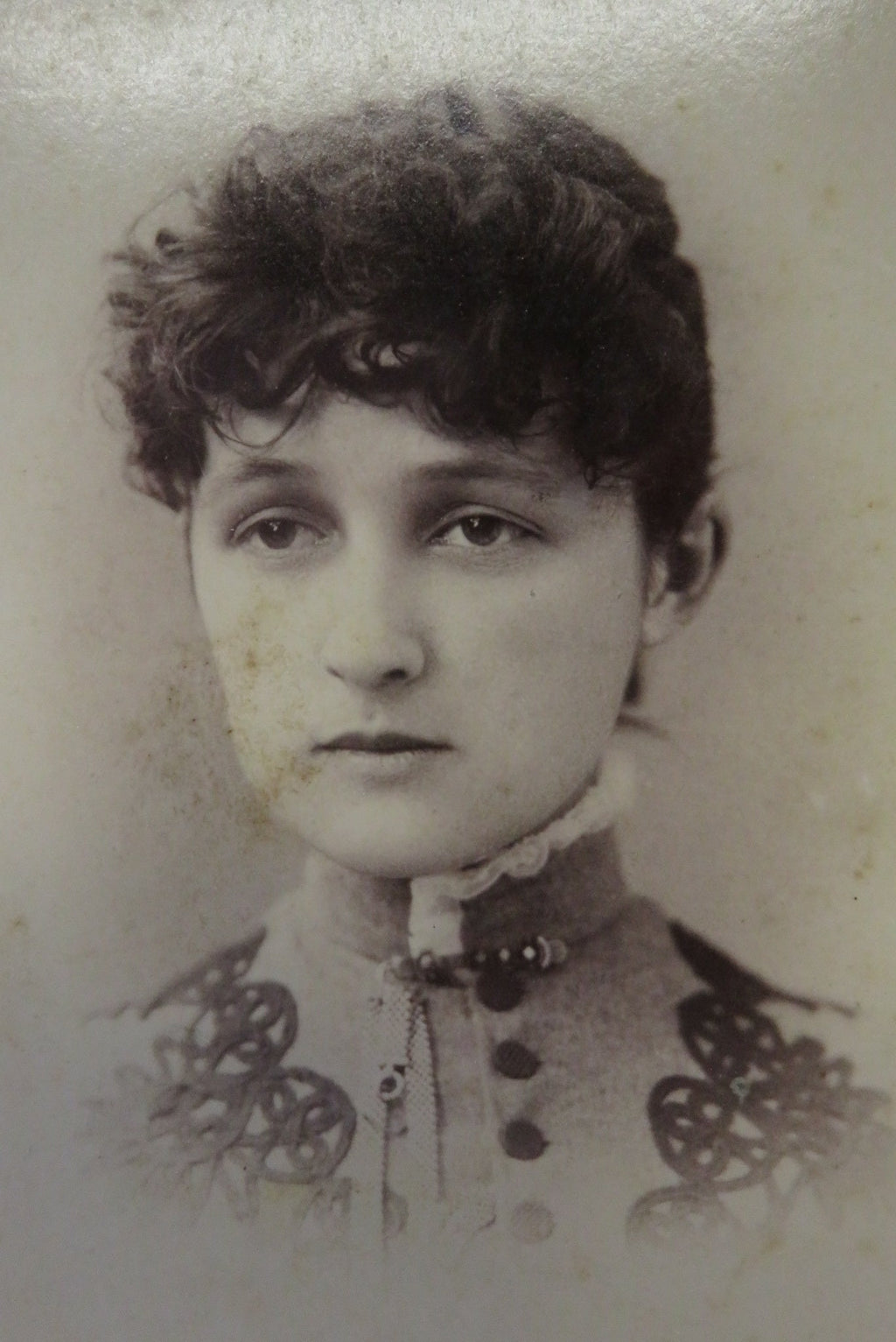 c1890 cabinet card photo of an attractive young woman with bookchain adornment of some type. Sitter is unnamed. Photo is by Sawtelle 98 Main Street Biddeford Maine