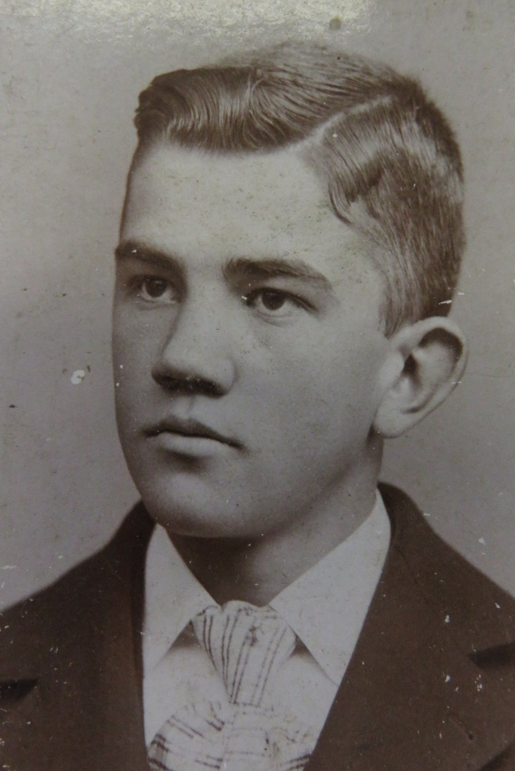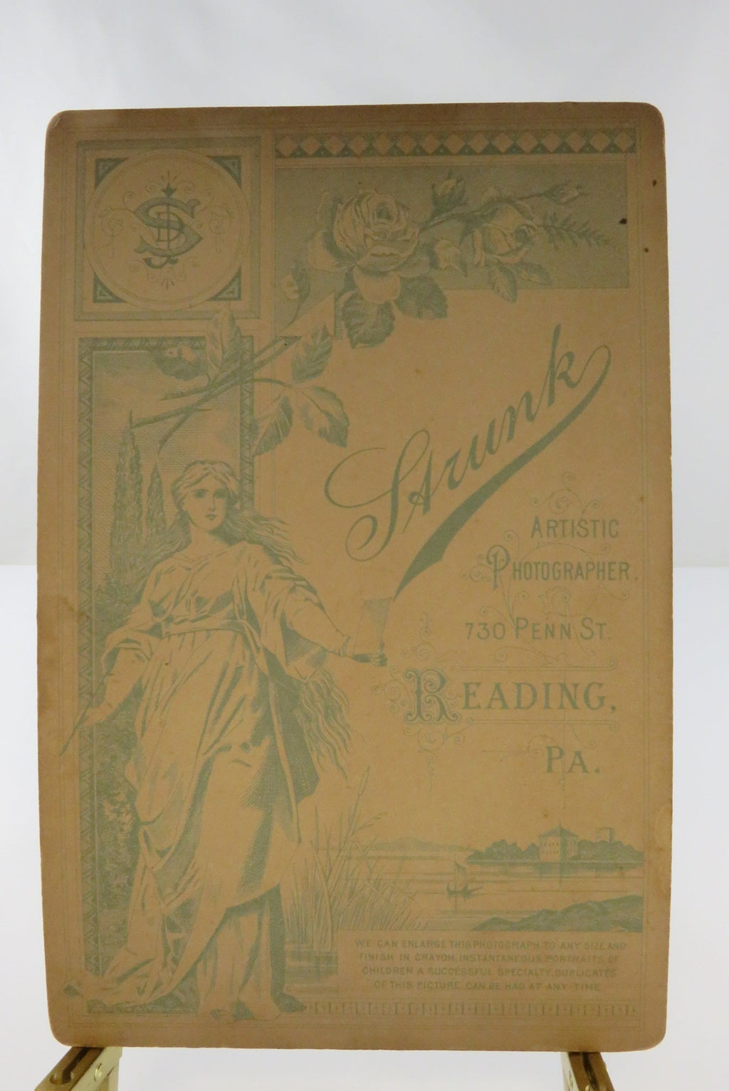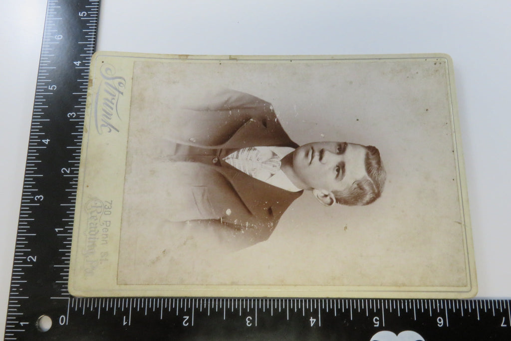 c1890 cabinet card photo of a young man with a large nose. Sitter is unnamed. Photo by Strunk 730 Penn St. Reading PA.