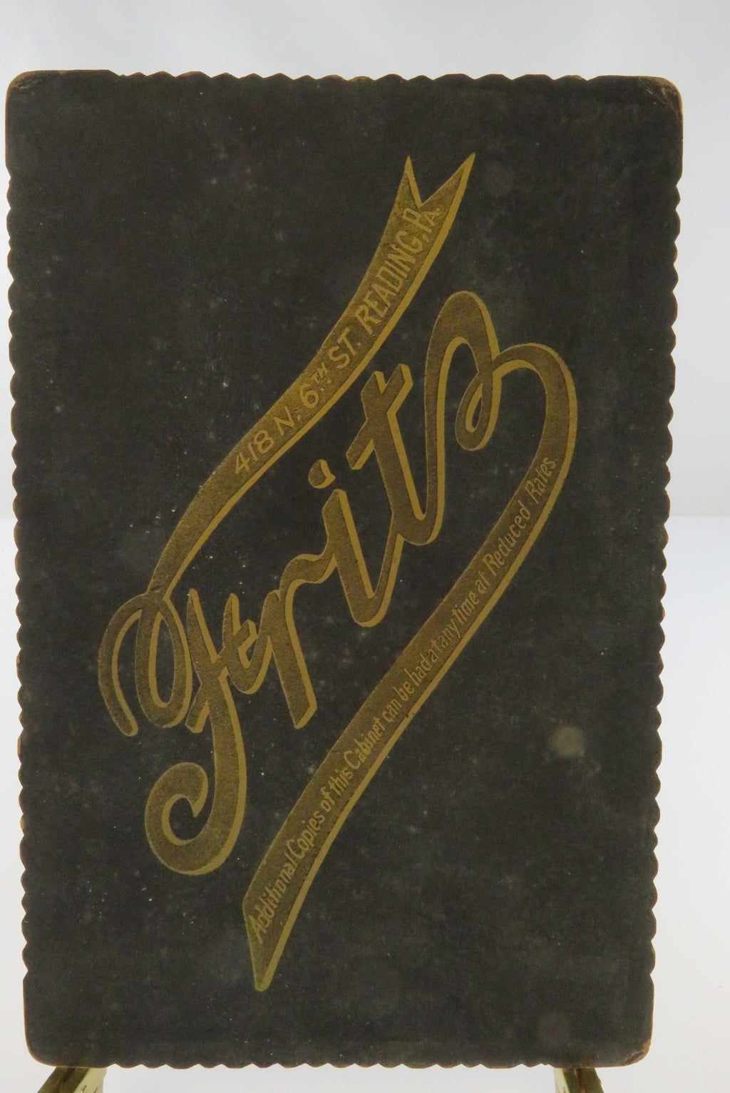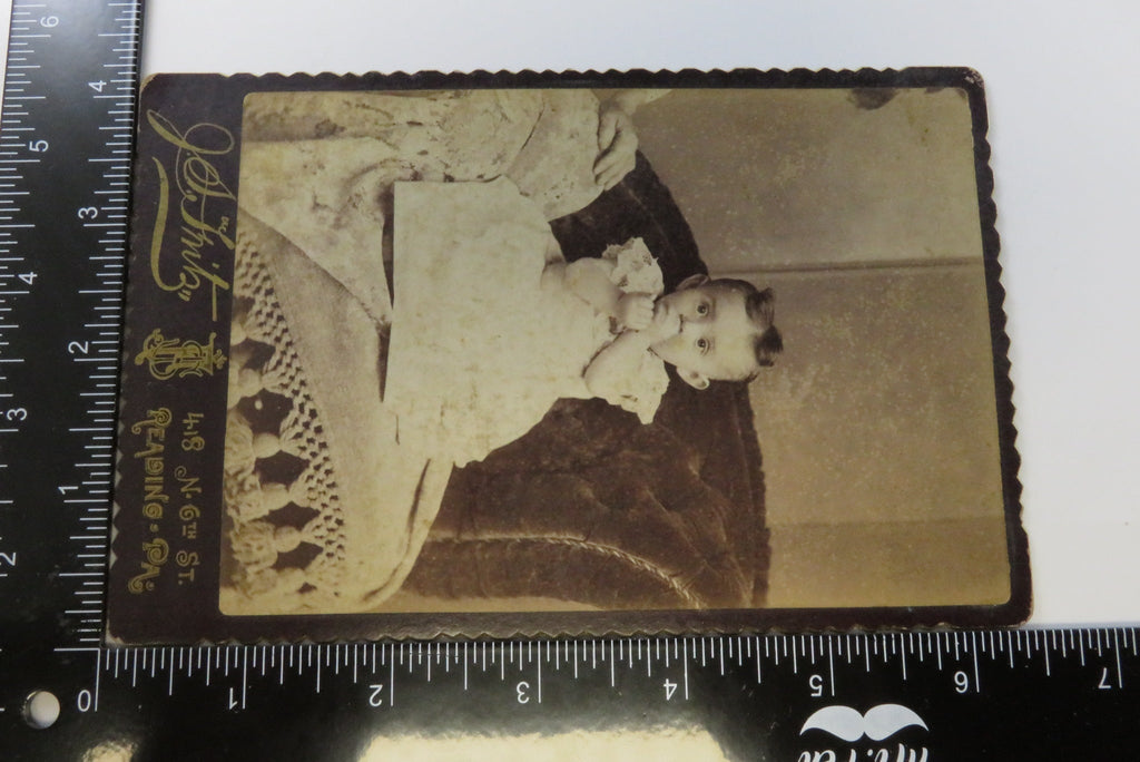 A c1890 cabinet card photo of a cute baby with hands to the mouth with moms hand visible on the couch. Die cut card. Sitter is unnamed. Photo by Fritz, 418 N 6th St, Reading PA.