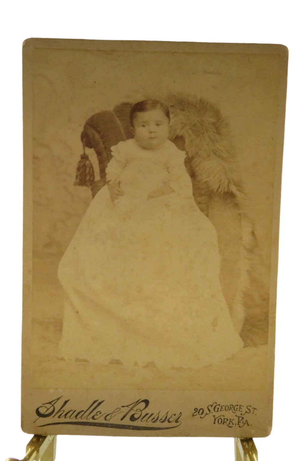 A c1890cabinet card photo of a chubby faced baby in a chair who looks like Asian American. Sitter is unnamed. Photo by Shadle & Busser, 20 S. George St, York, PA.