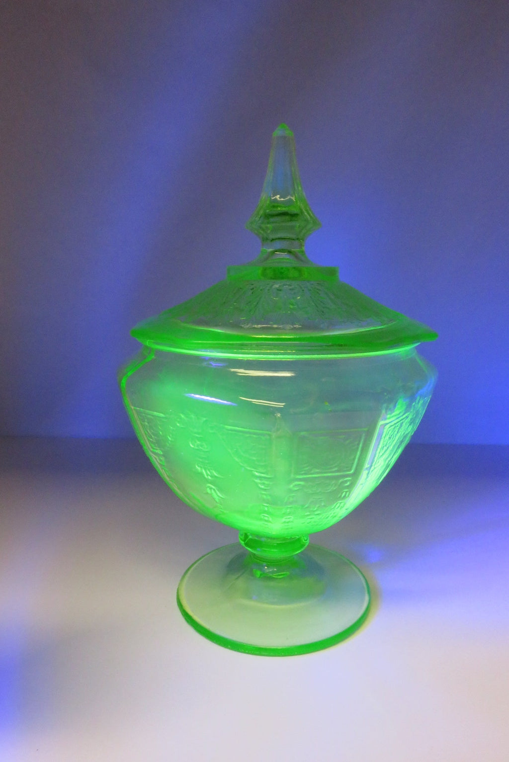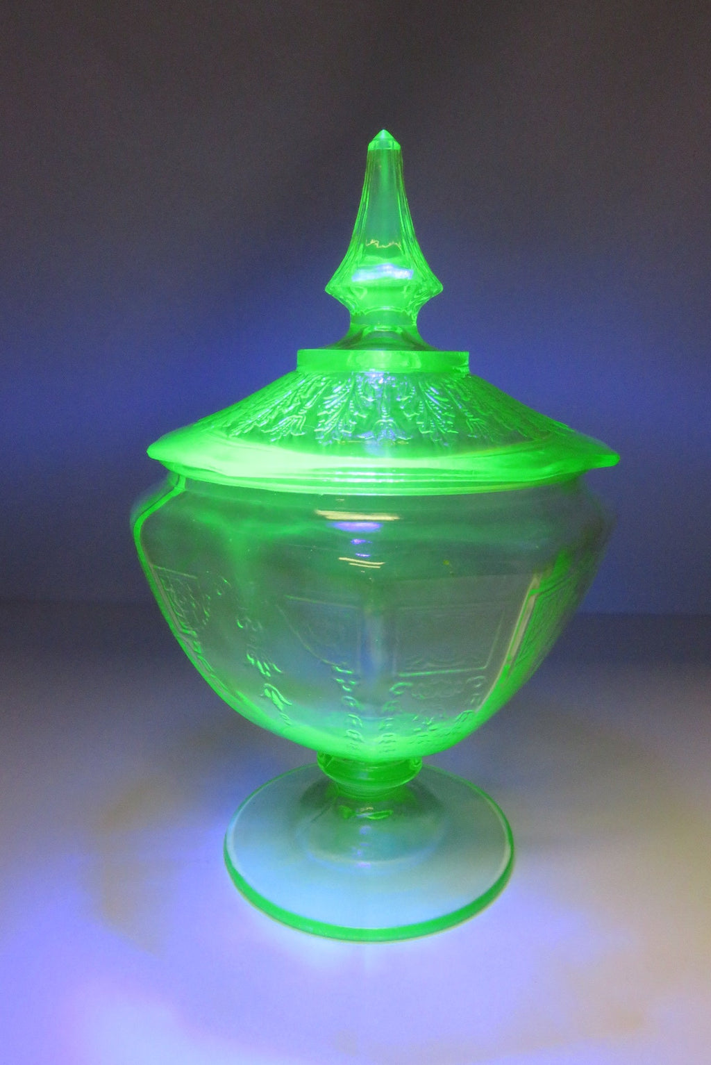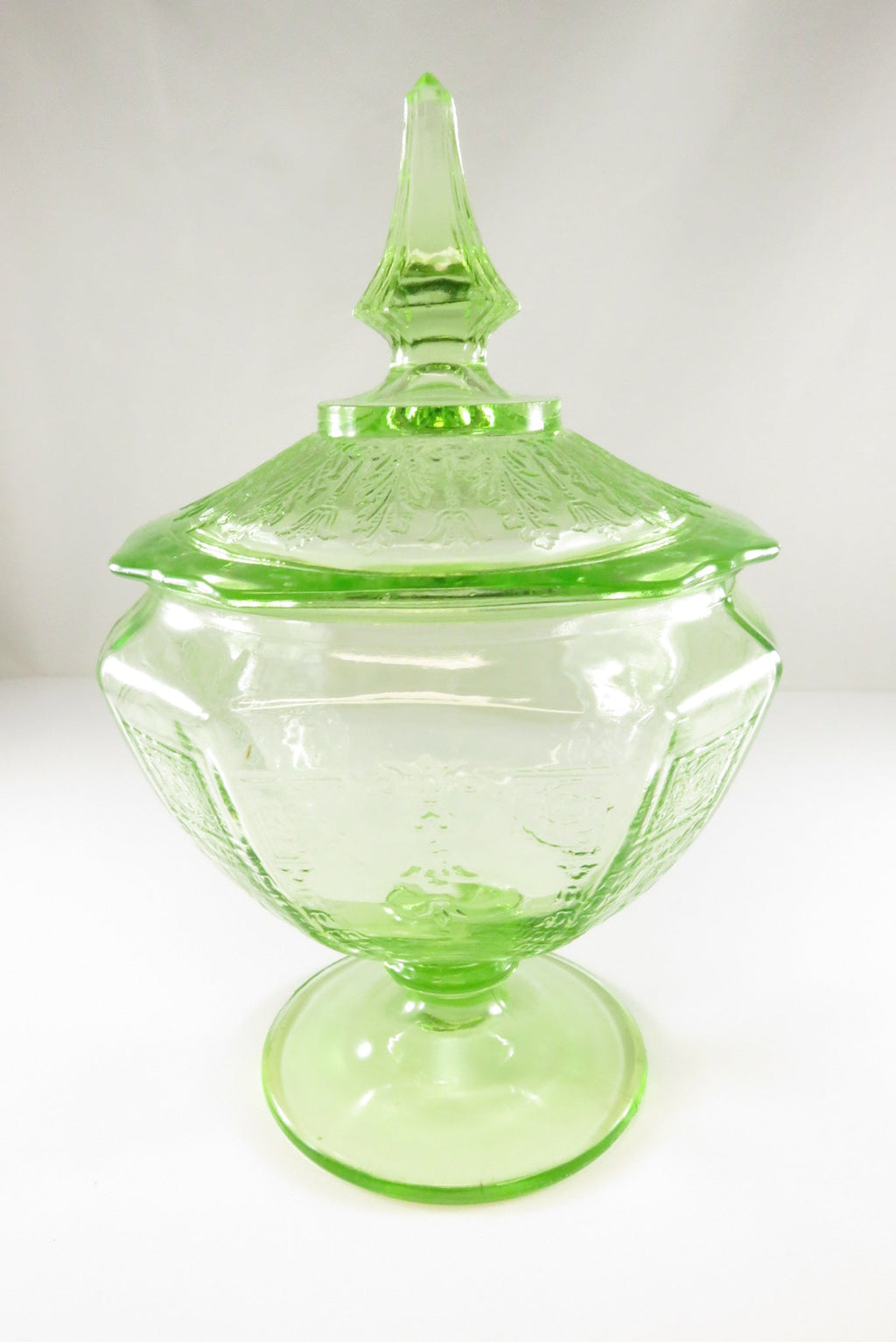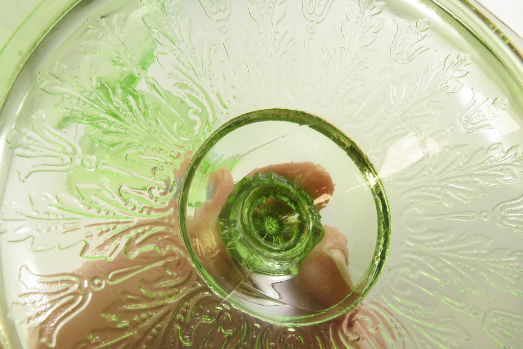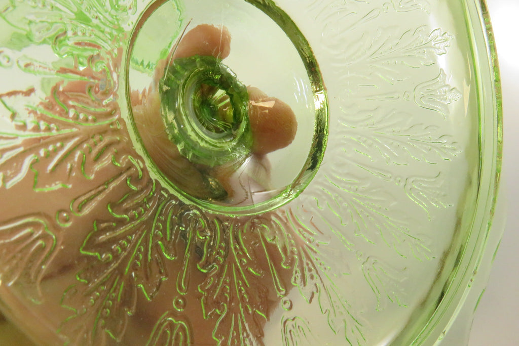 Green Vaseline Uranium Glass Covered Candy Dish Anchor Hockings Princess