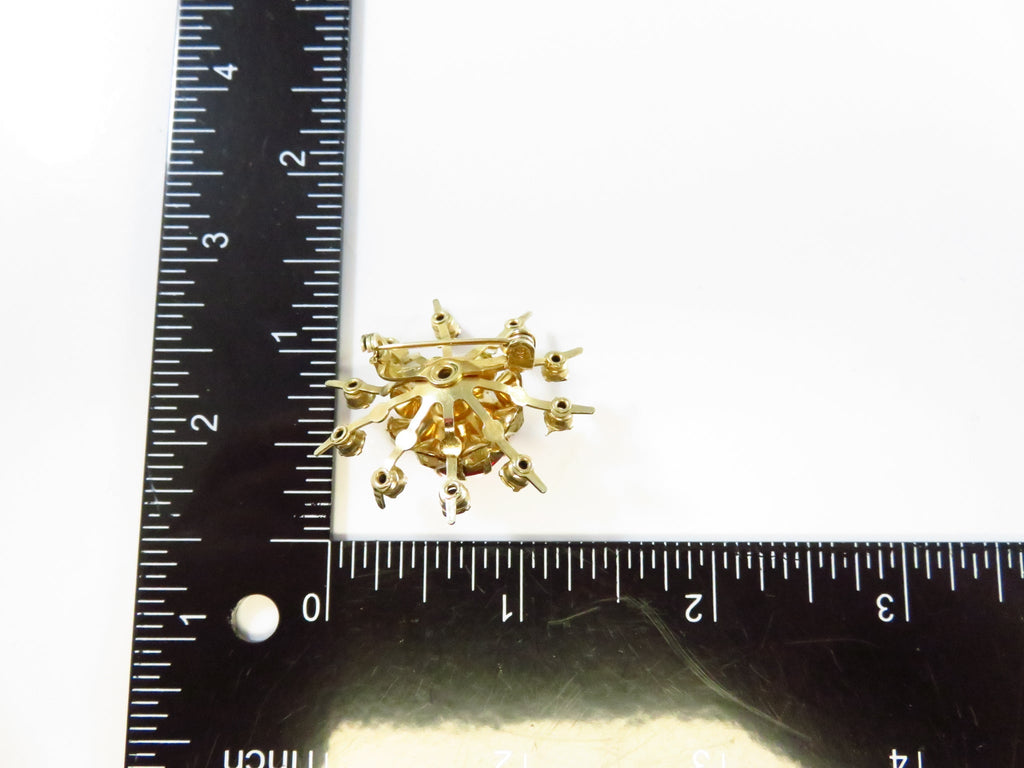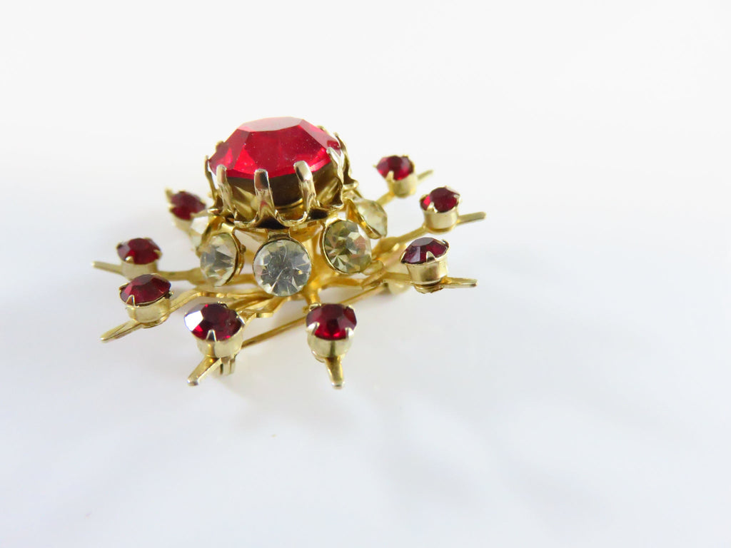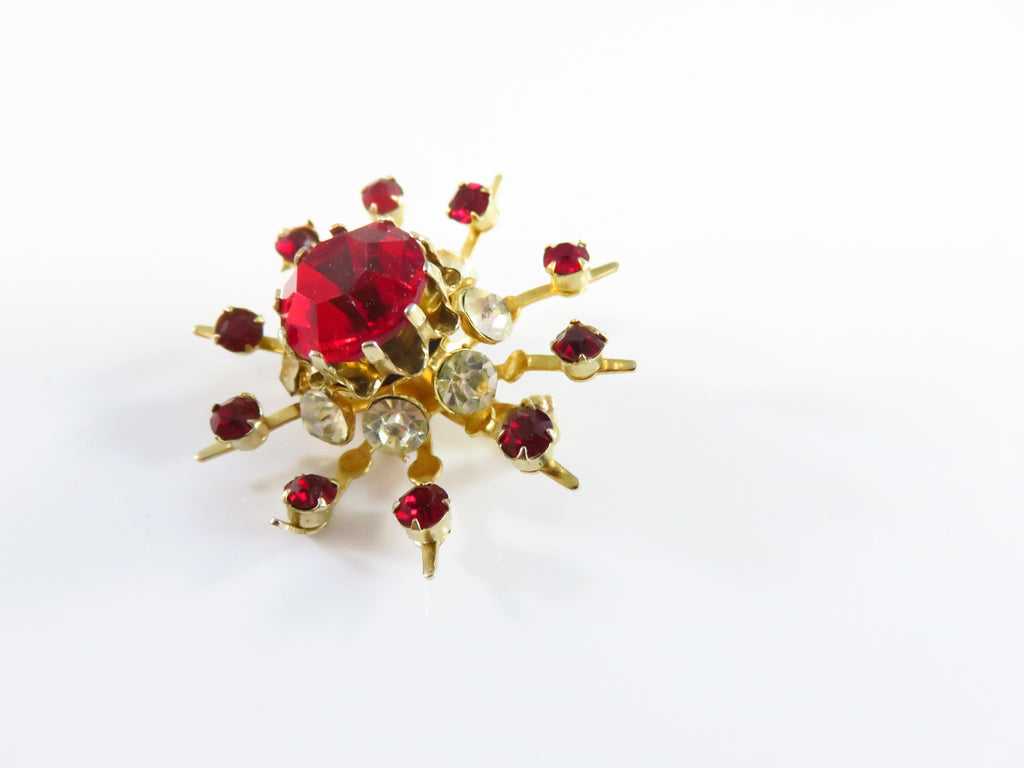 Starburst Rhinestone Brooch Red White Sparkle Gold Tone c1950's Coro Pin