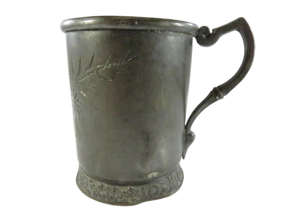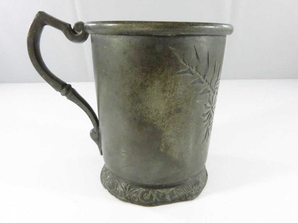 Antique Victorian Pewter Toddler Cup Etched Floral Design c.1880
