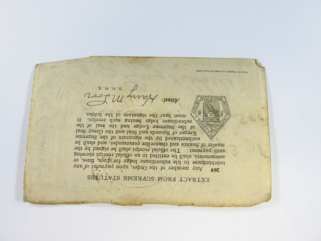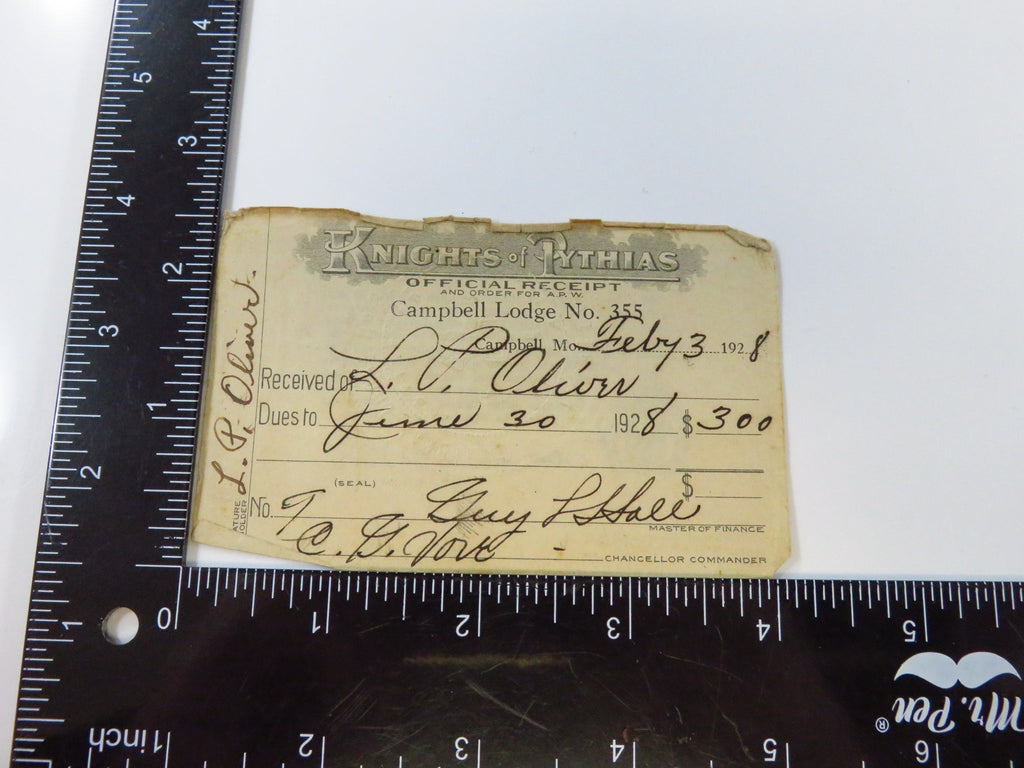 1928 Knights of Pythias Campbell Lodge No 355 MO Lloyd P Oliver Membership Receipt