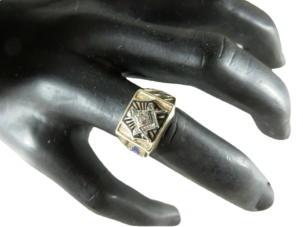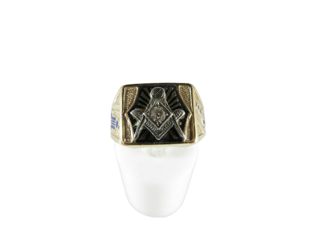 Masonic Ring 10K Gold Diamond Art Deco, Black, Blue Enamel, Old Mine Cut
