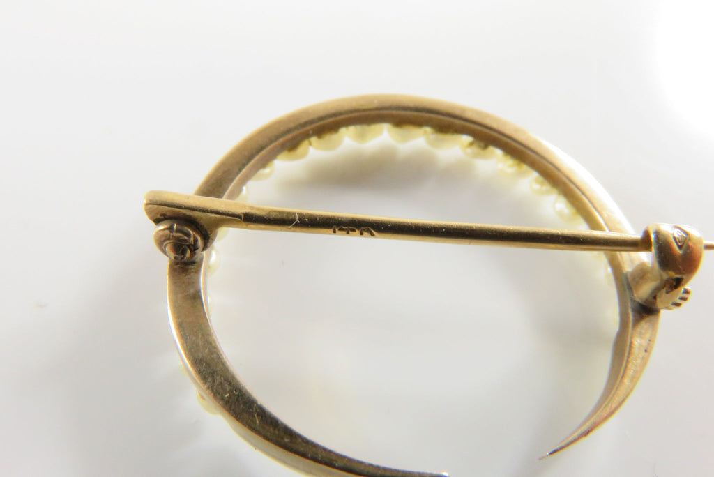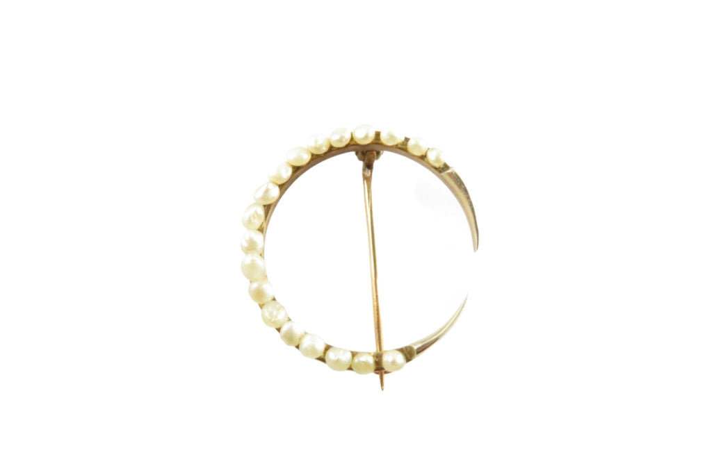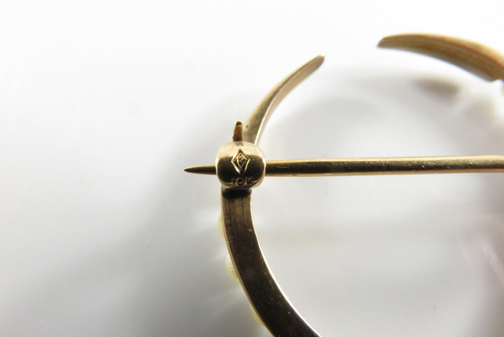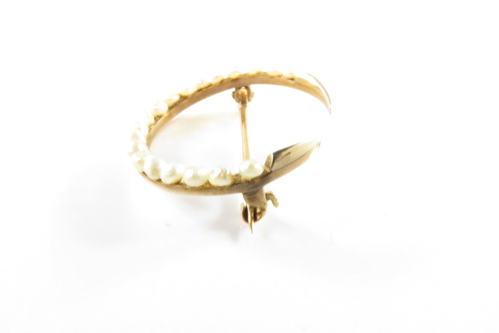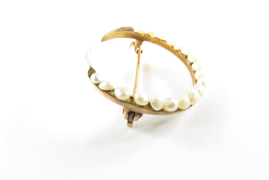 Antique Pearl Decorated Crescent Moon Brooch in 10K Yellow Gold