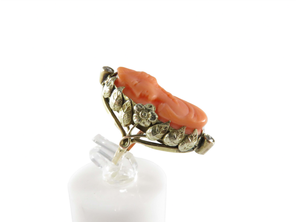 14K Gold Carved Coral Cameo Ring with Diamond Accents in Floral Leaf Setting Size 2.5