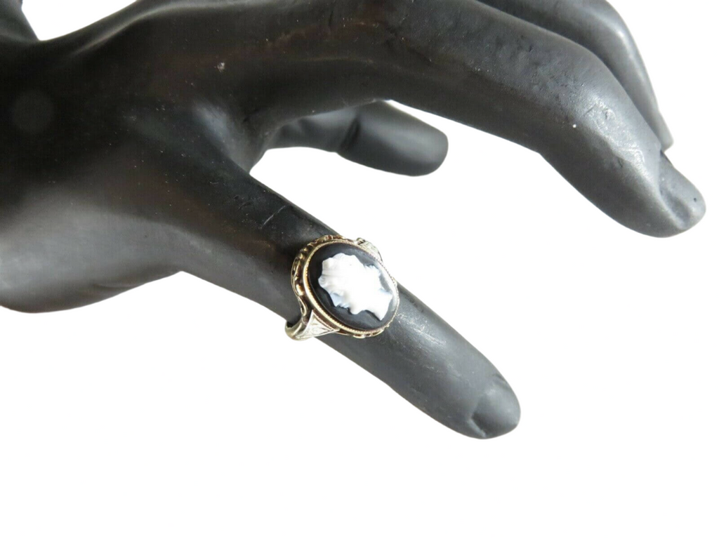 Antique 14K Gold Onyx Cameo Ring Art Nouveau Edwardian Style Size 5.5