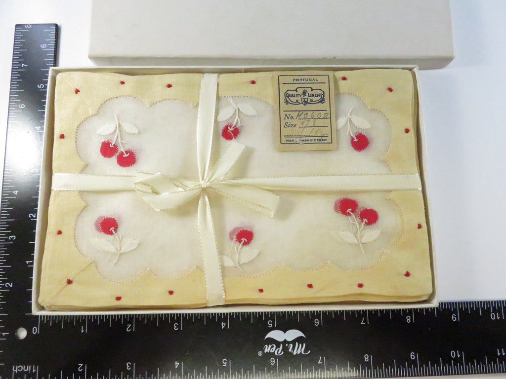 Leacock Madeira Hand Embroidery Sheer Linen Cocktail Napkins – Cherries Motif – Boxed Set of 12 (Portugal)