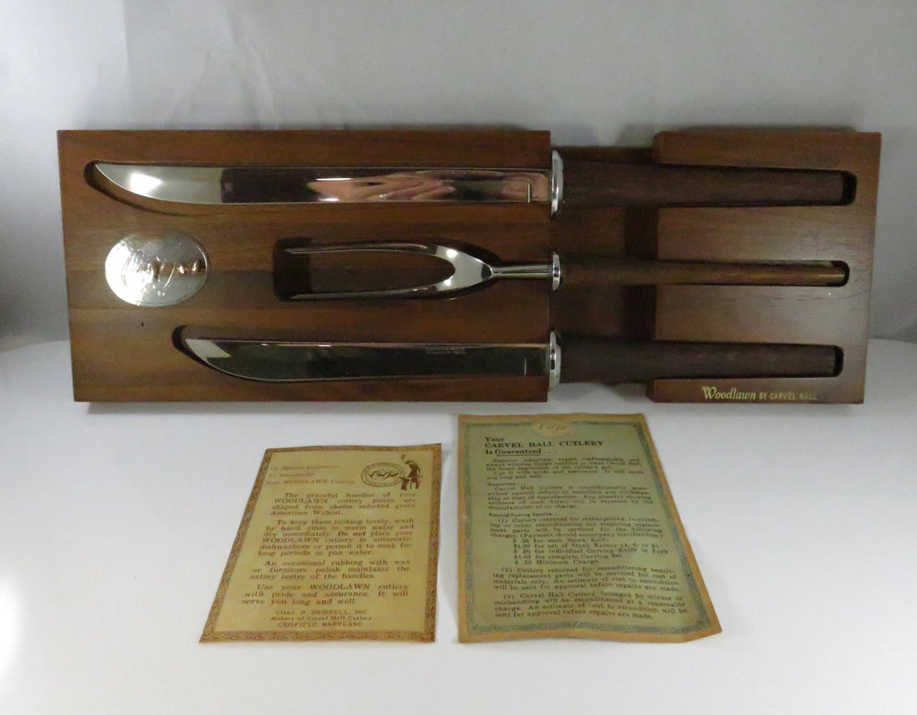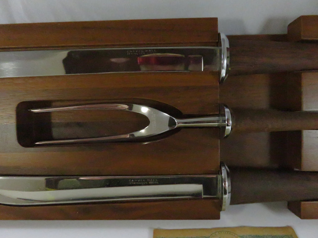 Vintage Carvel Hall Woodlawn Stainless Steel Carving Set Walnut Handles Drawer Tray