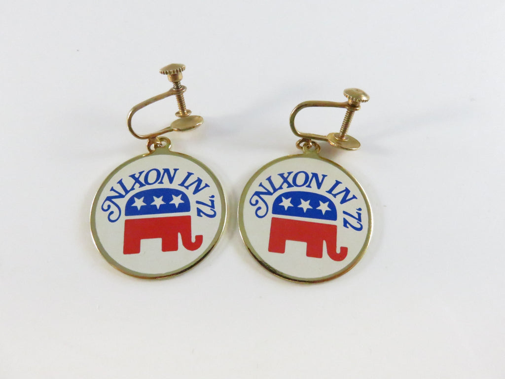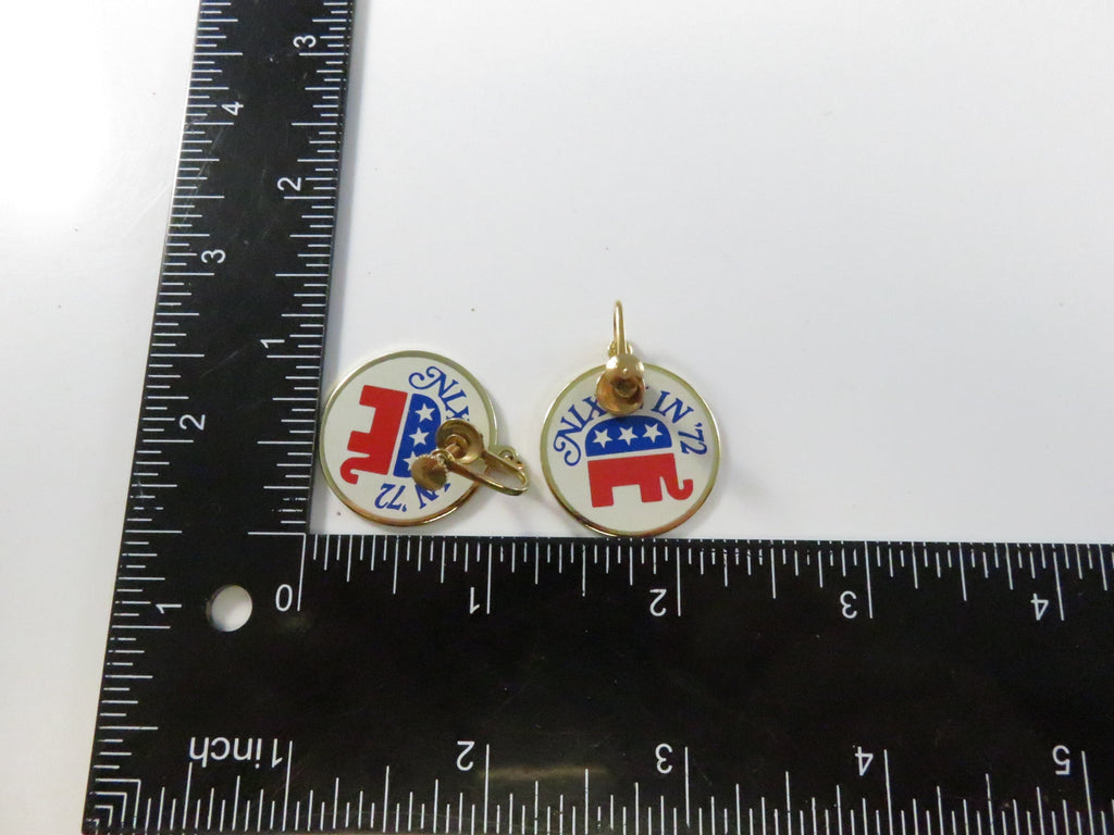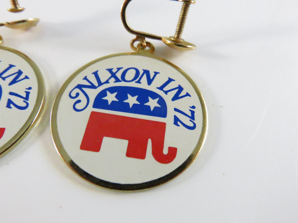 1972 Nixon in '72 Republican Elephant Screw-Back Dangle Earrings Campaign Jewelry