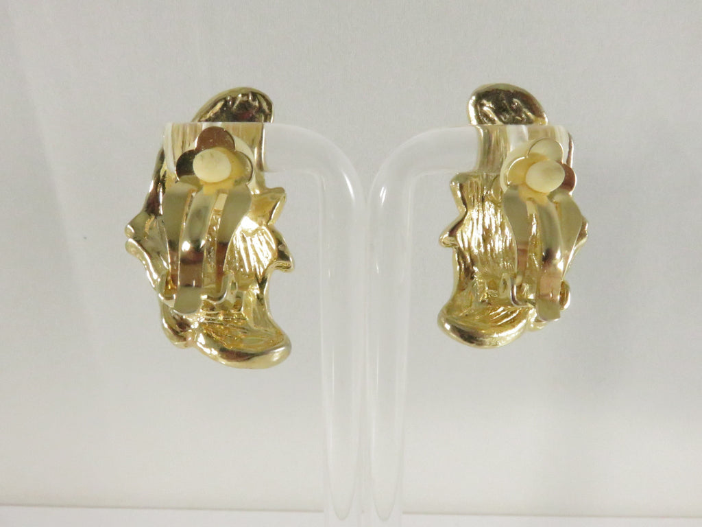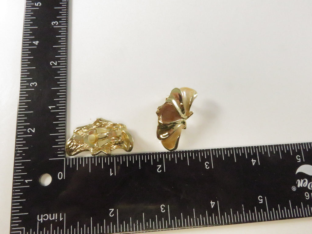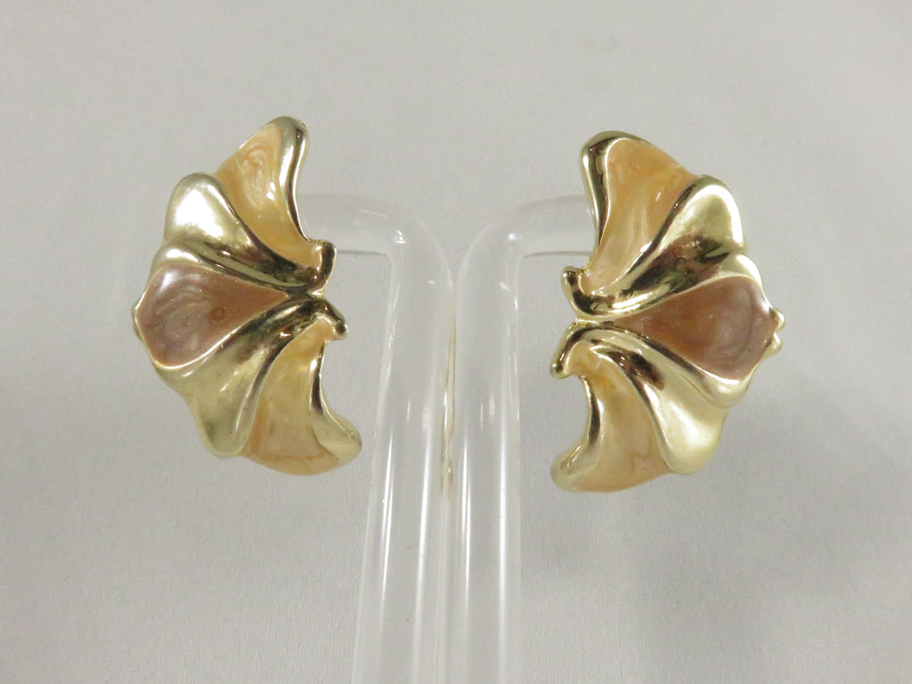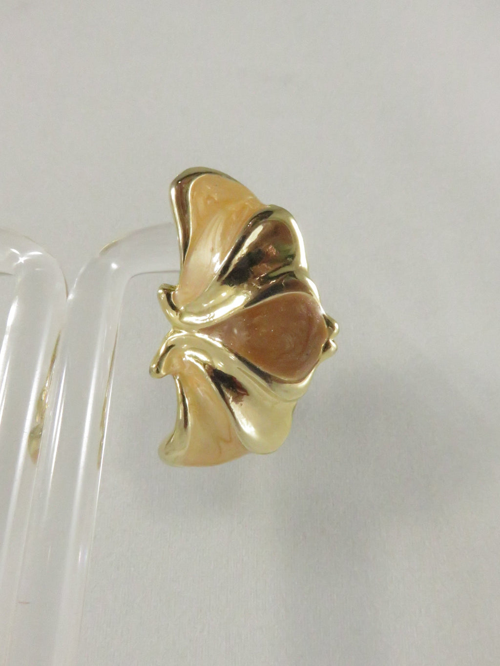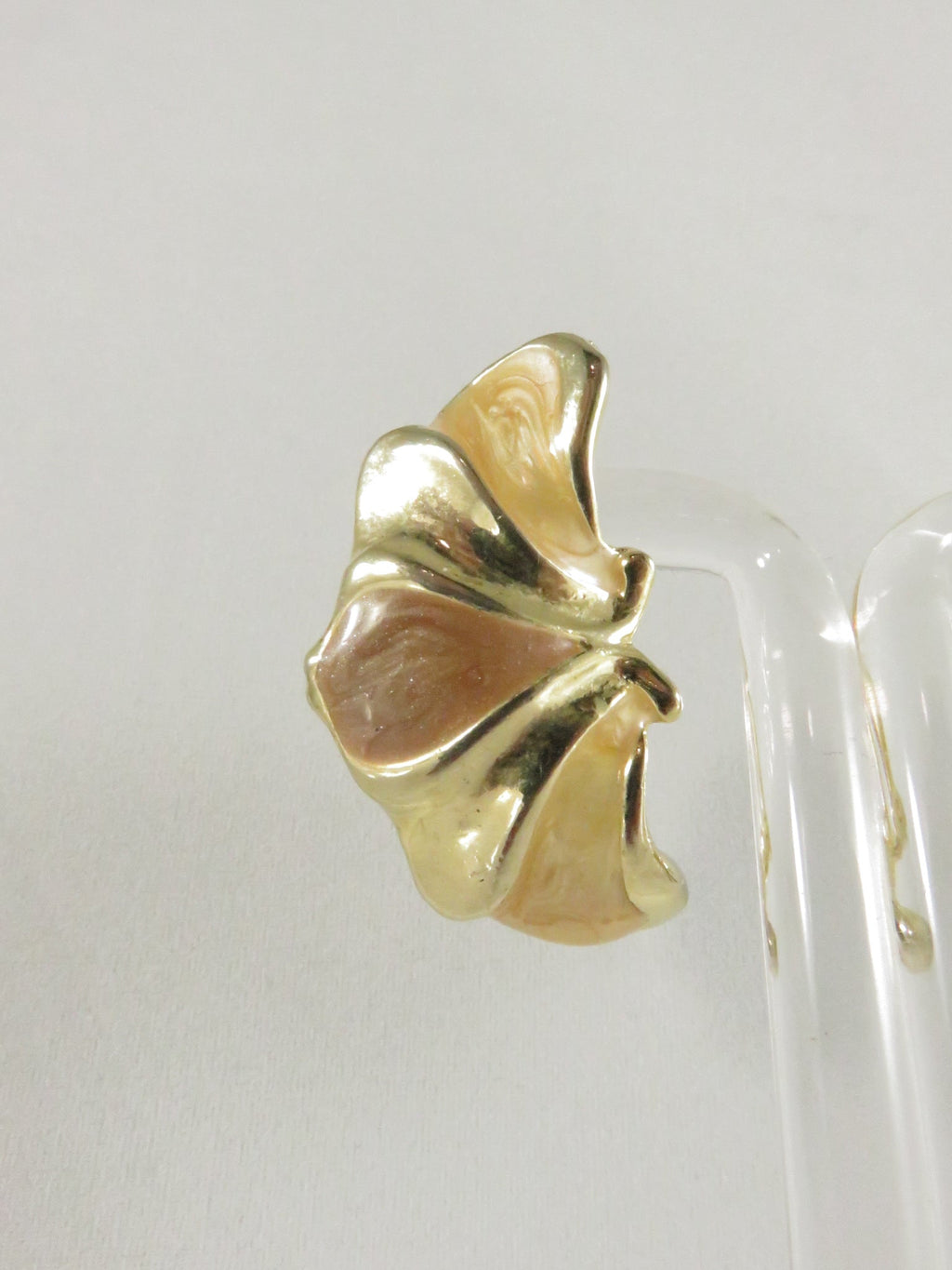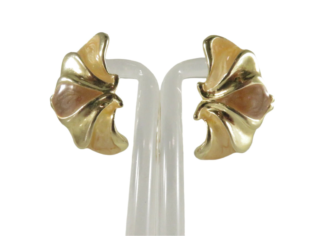 1980s Petal Clip Earrings, Glitter Enamel, Cream Brown, Gold Tone, 1.37" Height