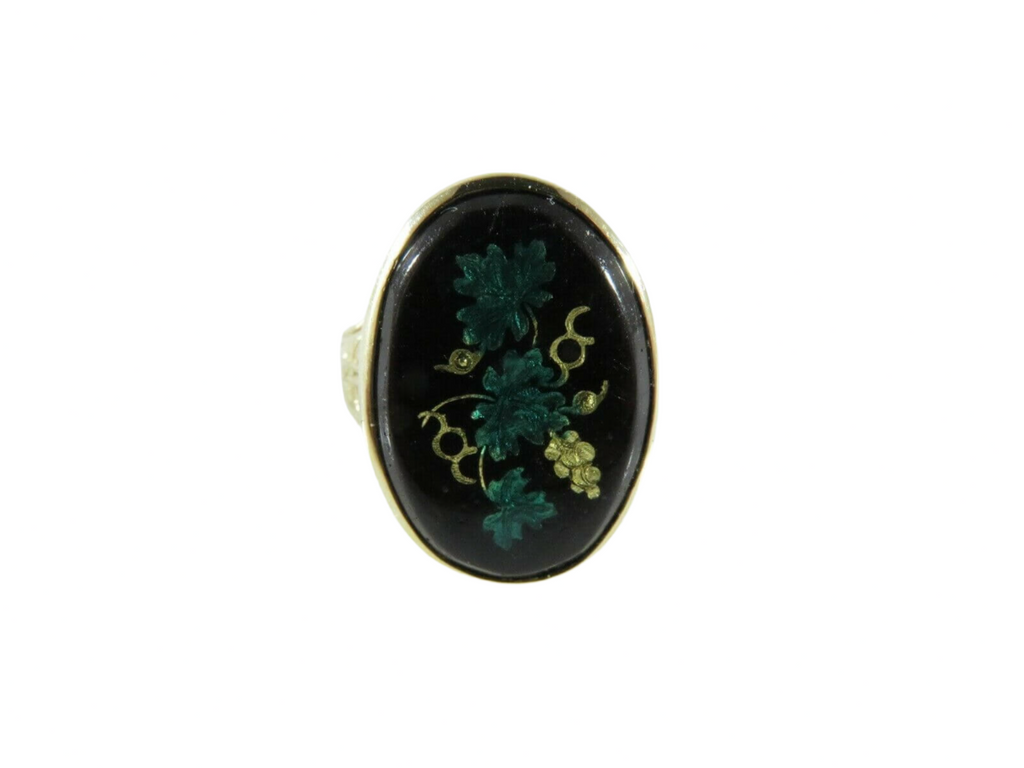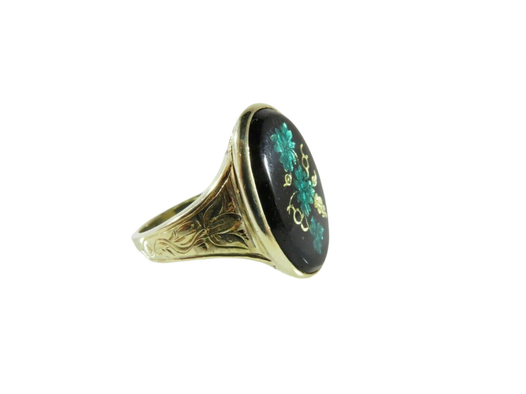Antique 14K Gold Reverse-Painted Glass Floral Plaque Ring c.1910–1930 (≈8 g, Sz 6)