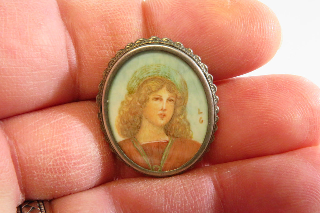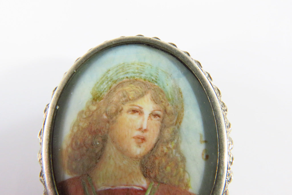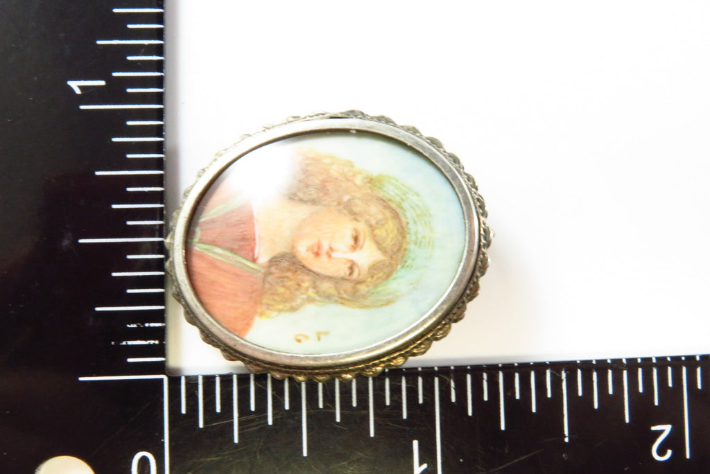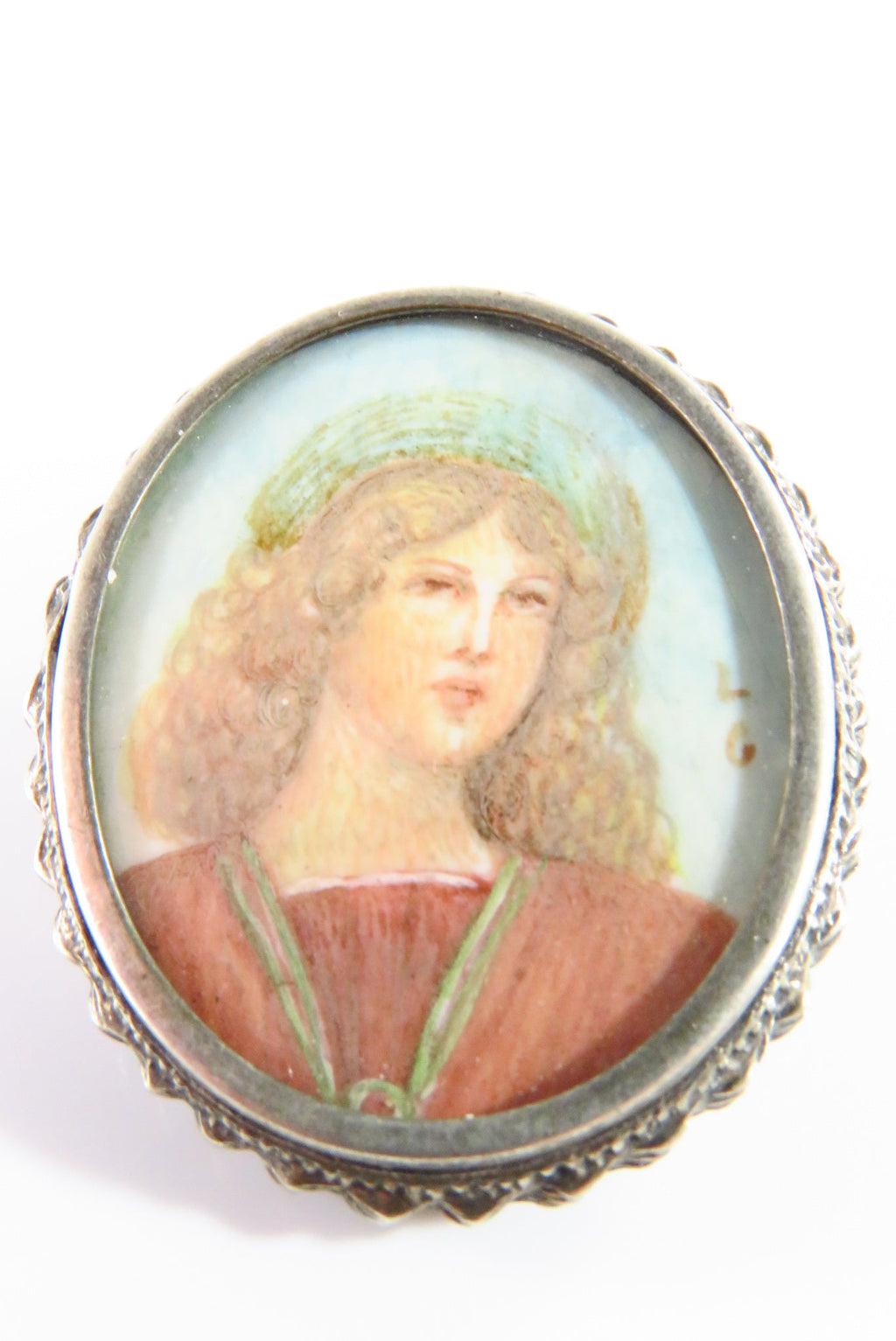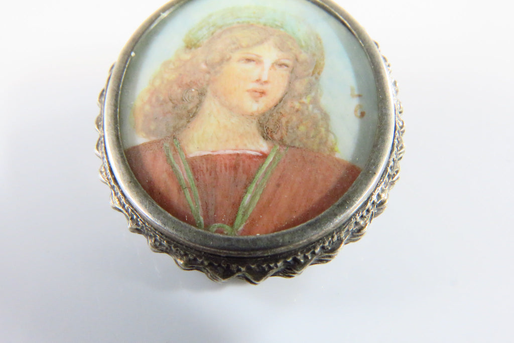 Antique Hand Painted Miniature Of Woman Signed LG 800 Silver Pendant Brooch