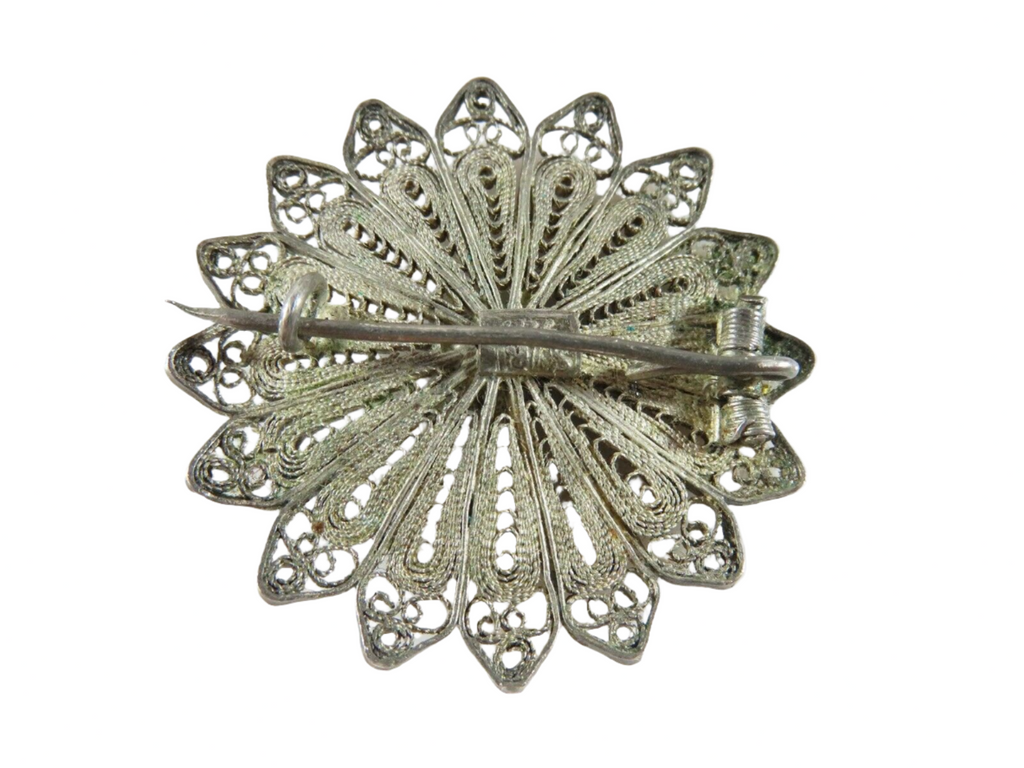 Old Sterling Silver Fancy Filigree Flower Brooch 1 1/2"