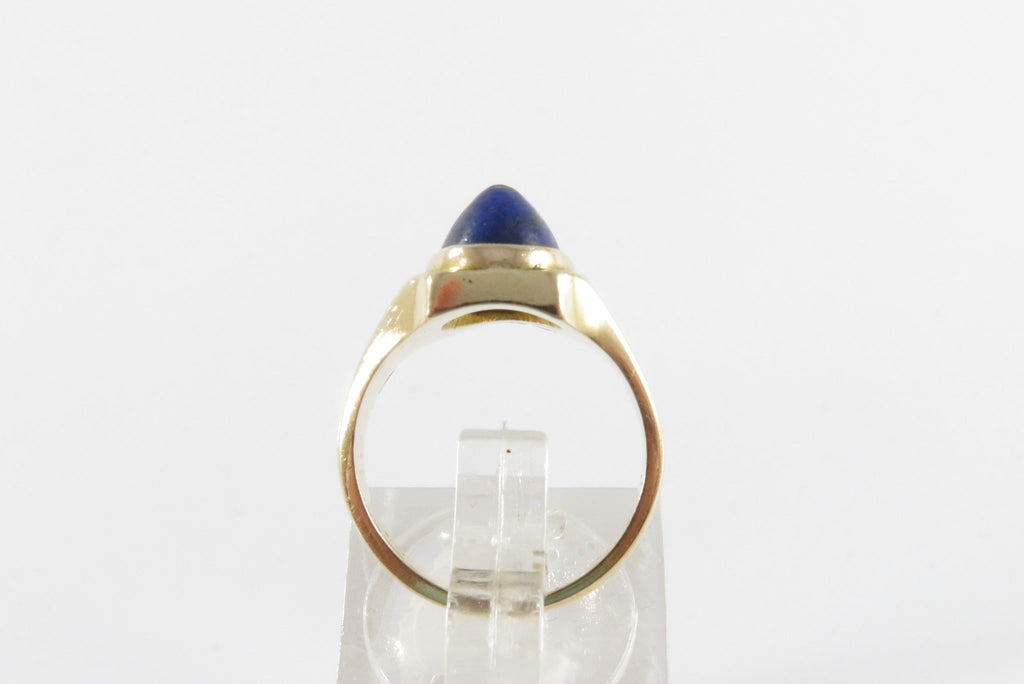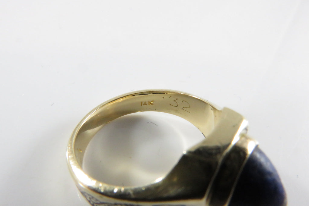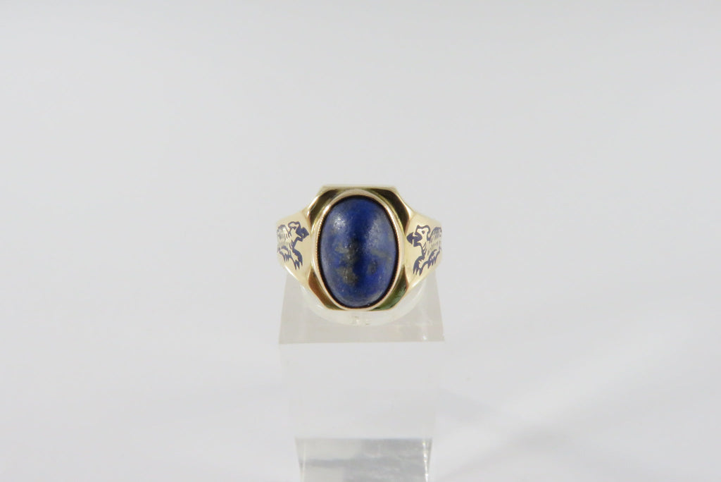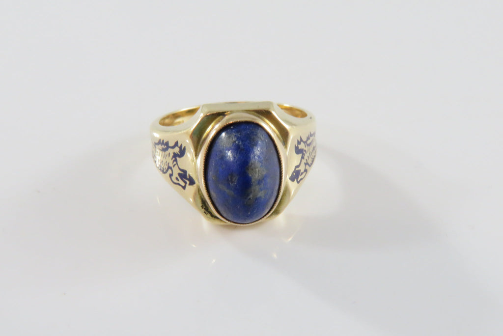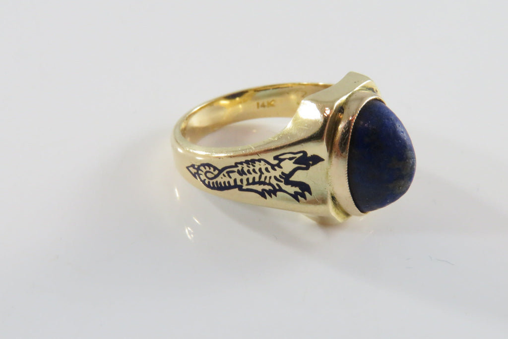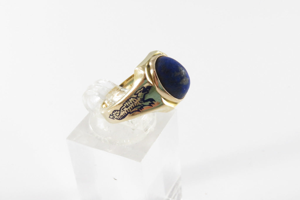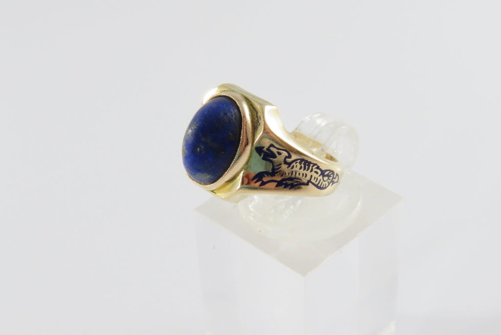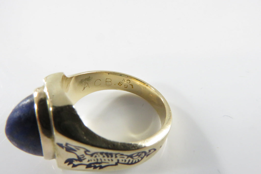 Art Deco 14K Oval Sugarloaf Lapis Lazuli Blue Enameled Griffin Dragon Ring Size