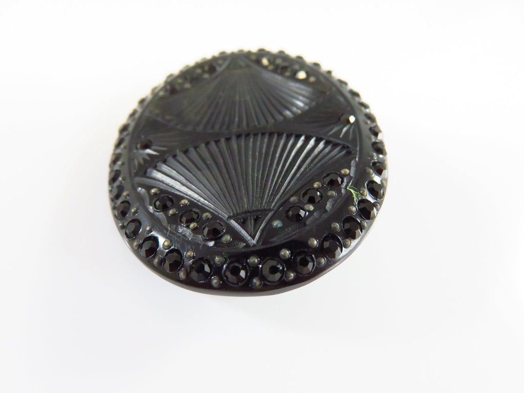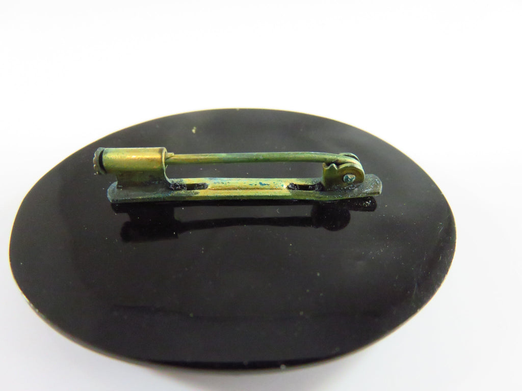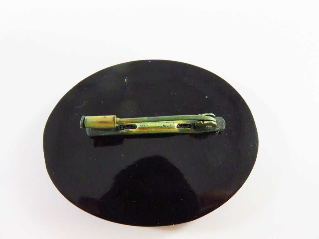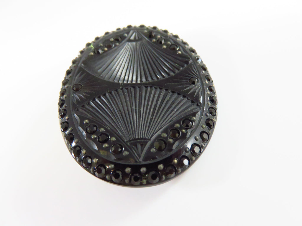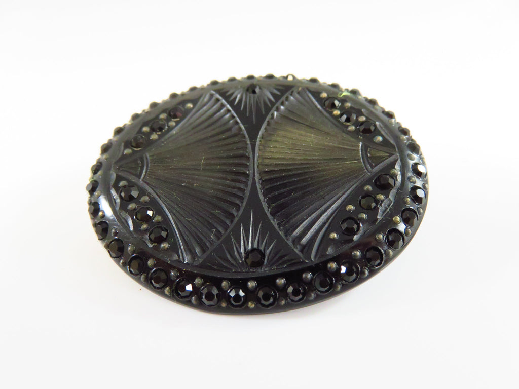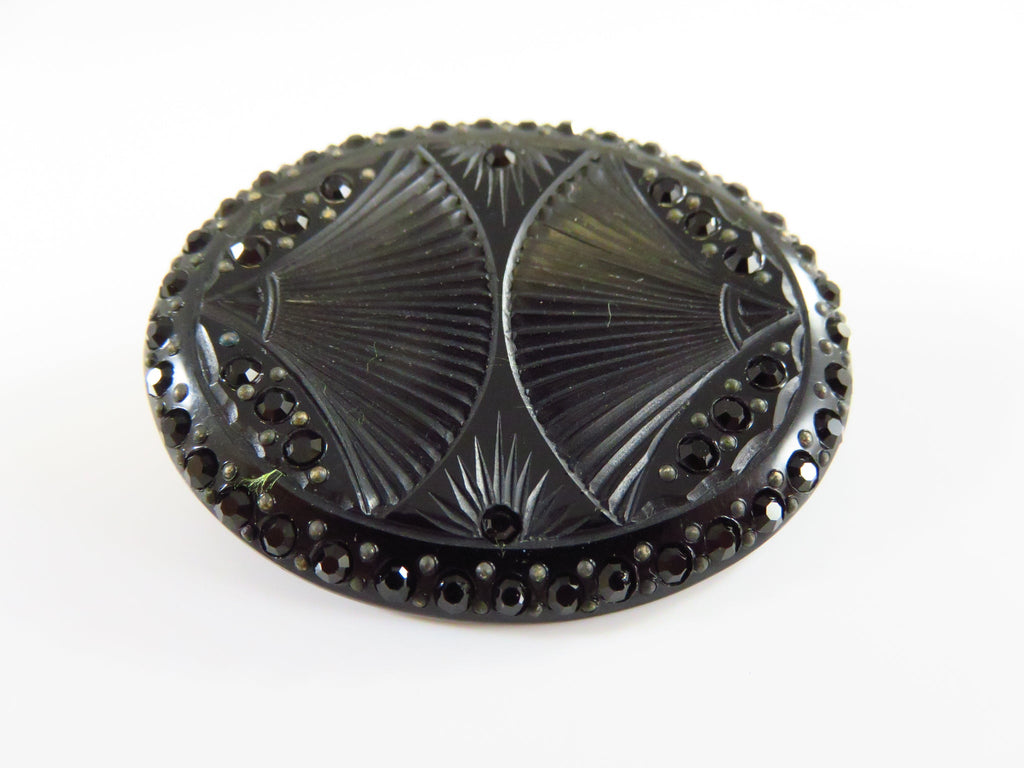 Art Deco Inspired Dual Fan Faceted Sparkling Plastic Oval Brooch Pin in Black