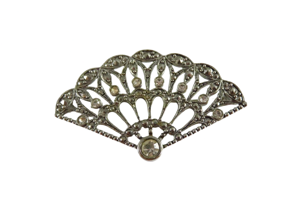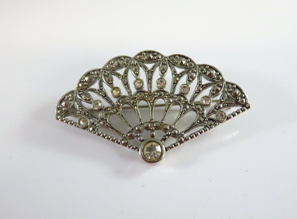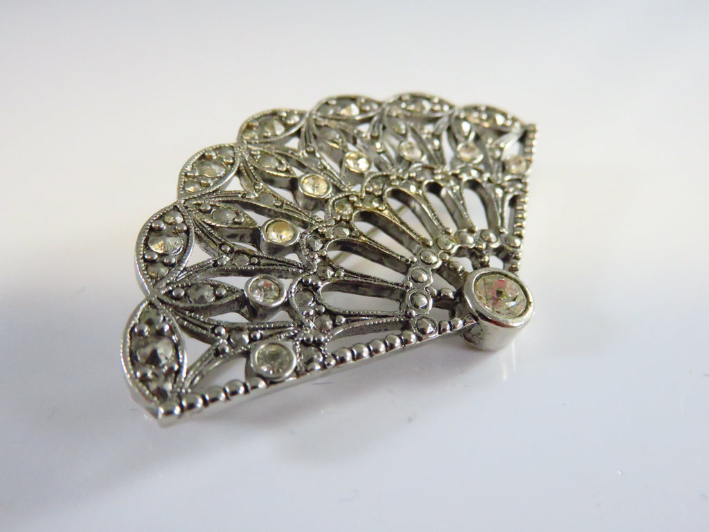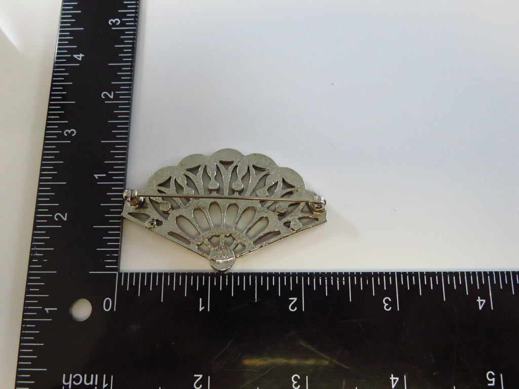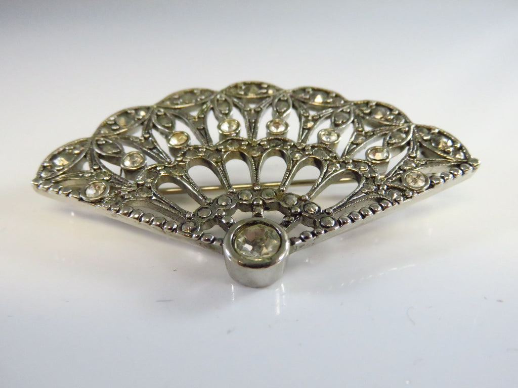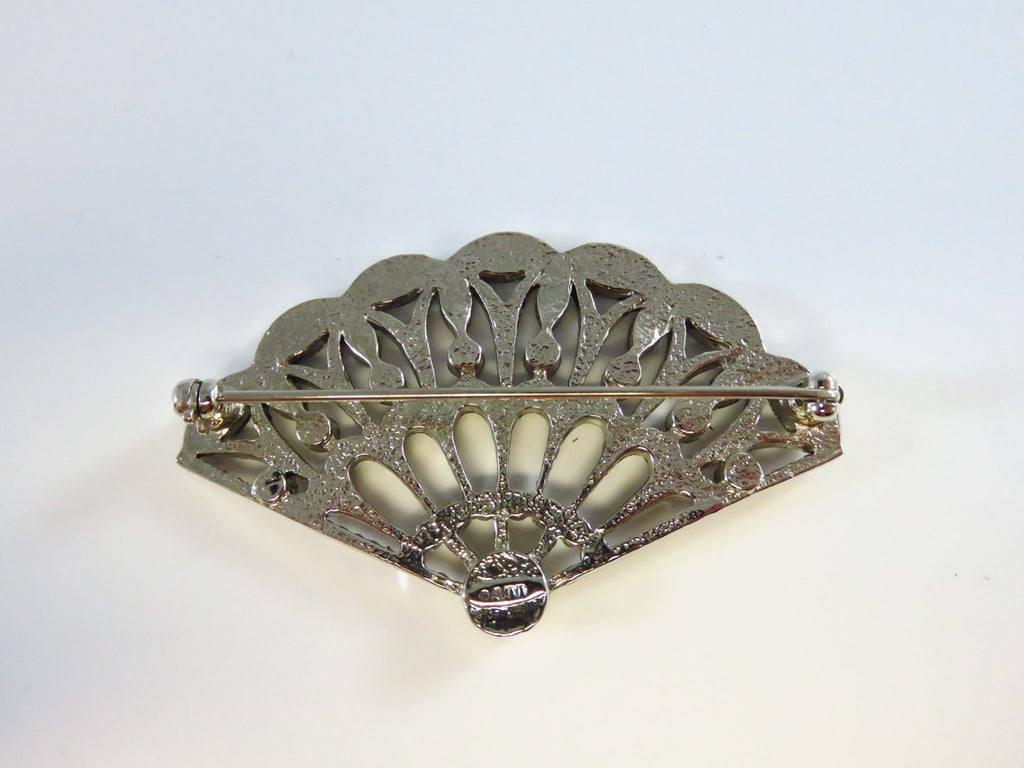 Art Deco Style Fan Brooch White Metal Clear Stones By Avon 2 1/4" Wide