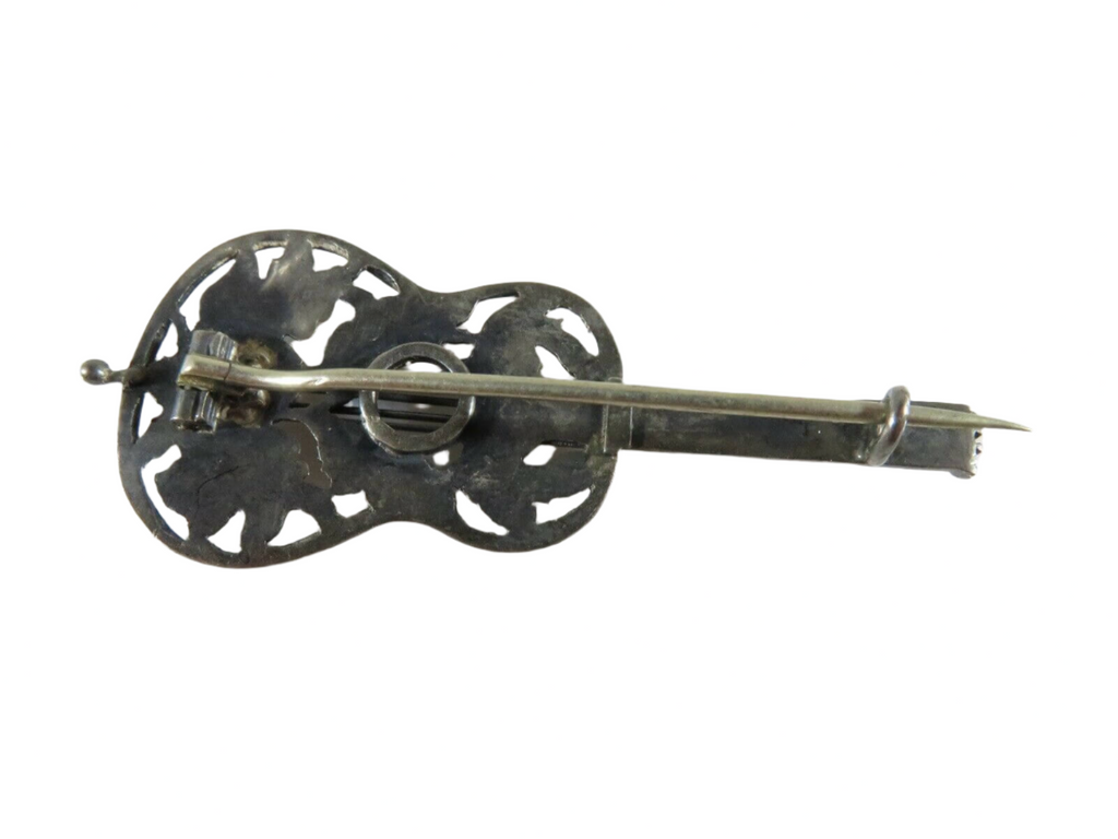 Beautiful Victorian Guitar Brooch Floral Decor Forget Me Not in Sterling