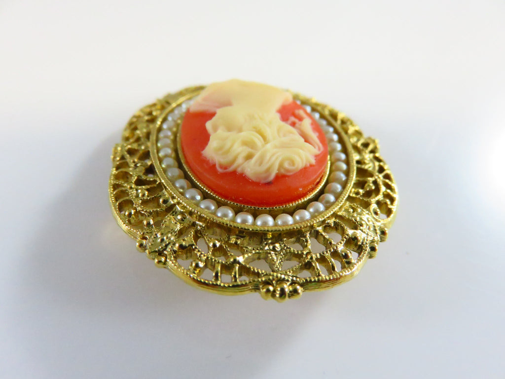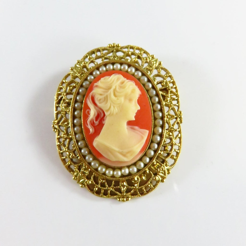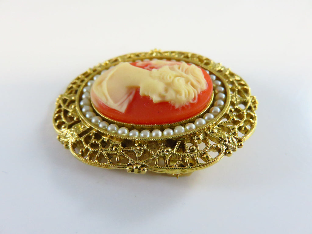 Cameo Brooch Pearl Surround Pierced Gilded Frame Celluloid Cameo