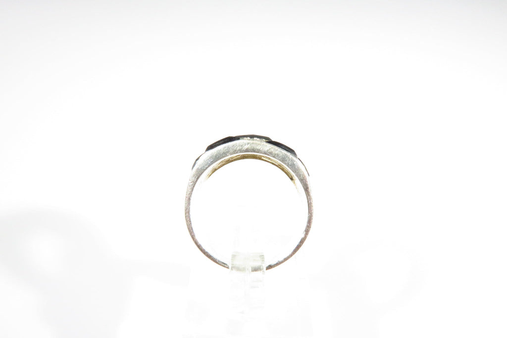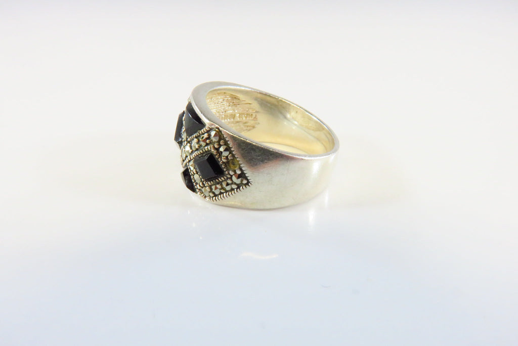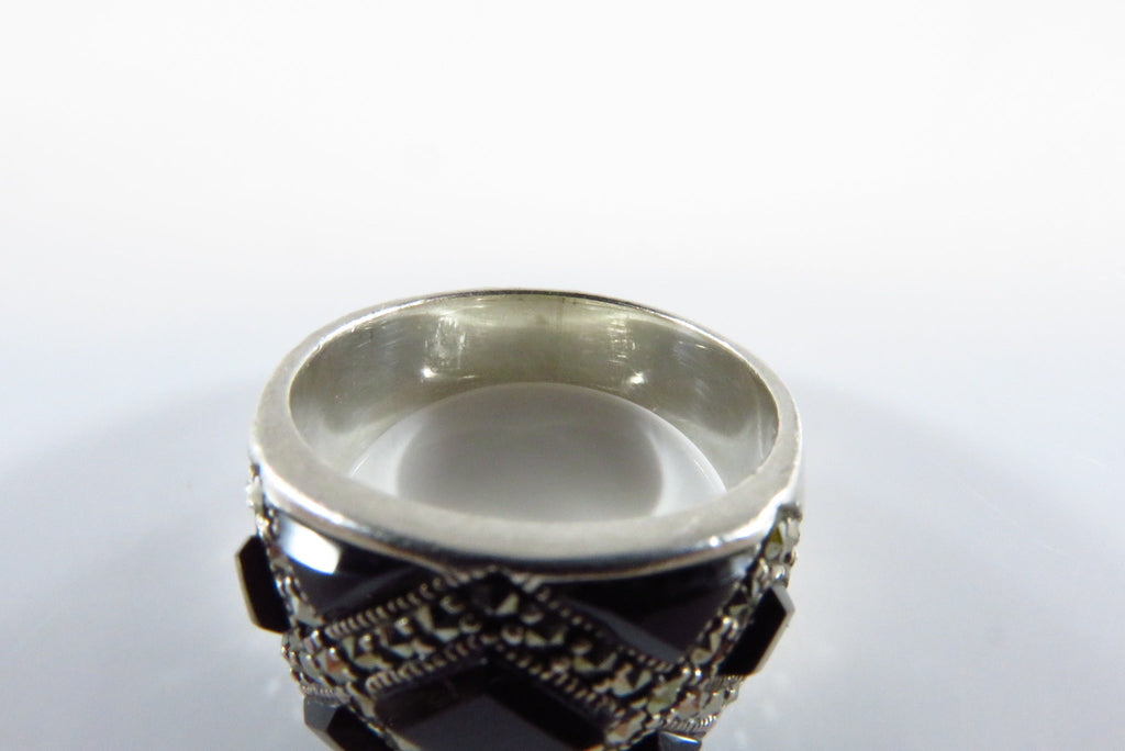 Fashionable Onyx & Marcasite Accented Sterling Silver Band Ring Size 5 3/4