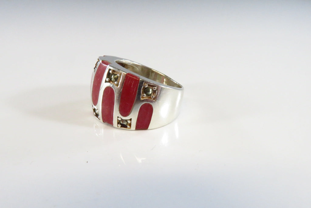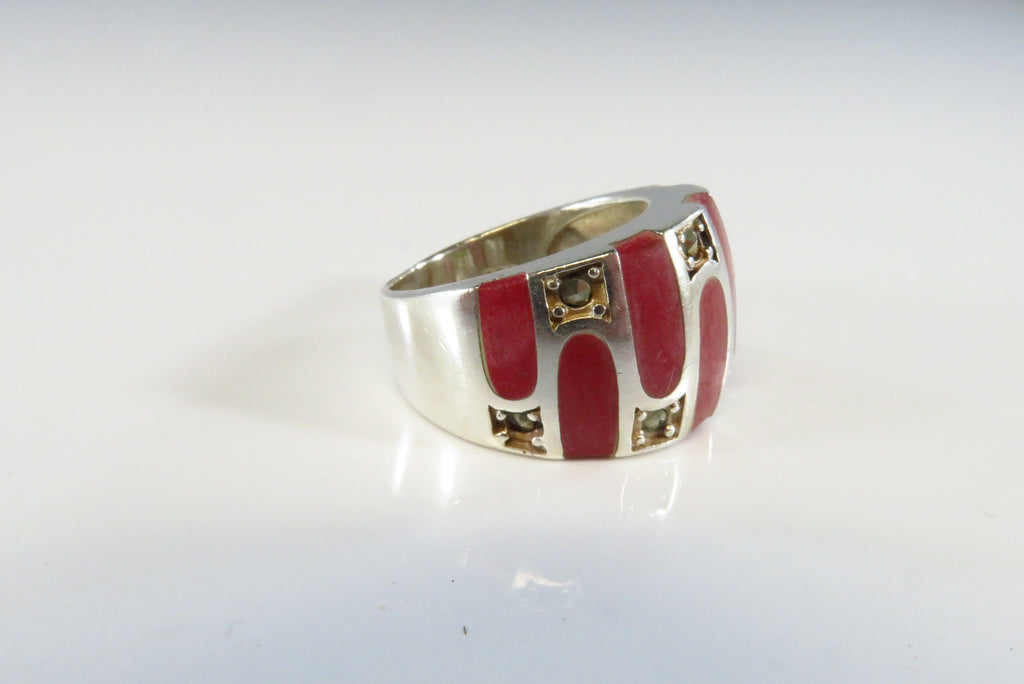 Marcasite and Inlaid Dyed Red Resin Sterling Silver Band Ring Size 6.5