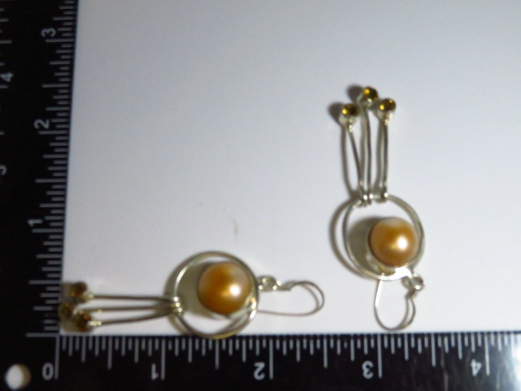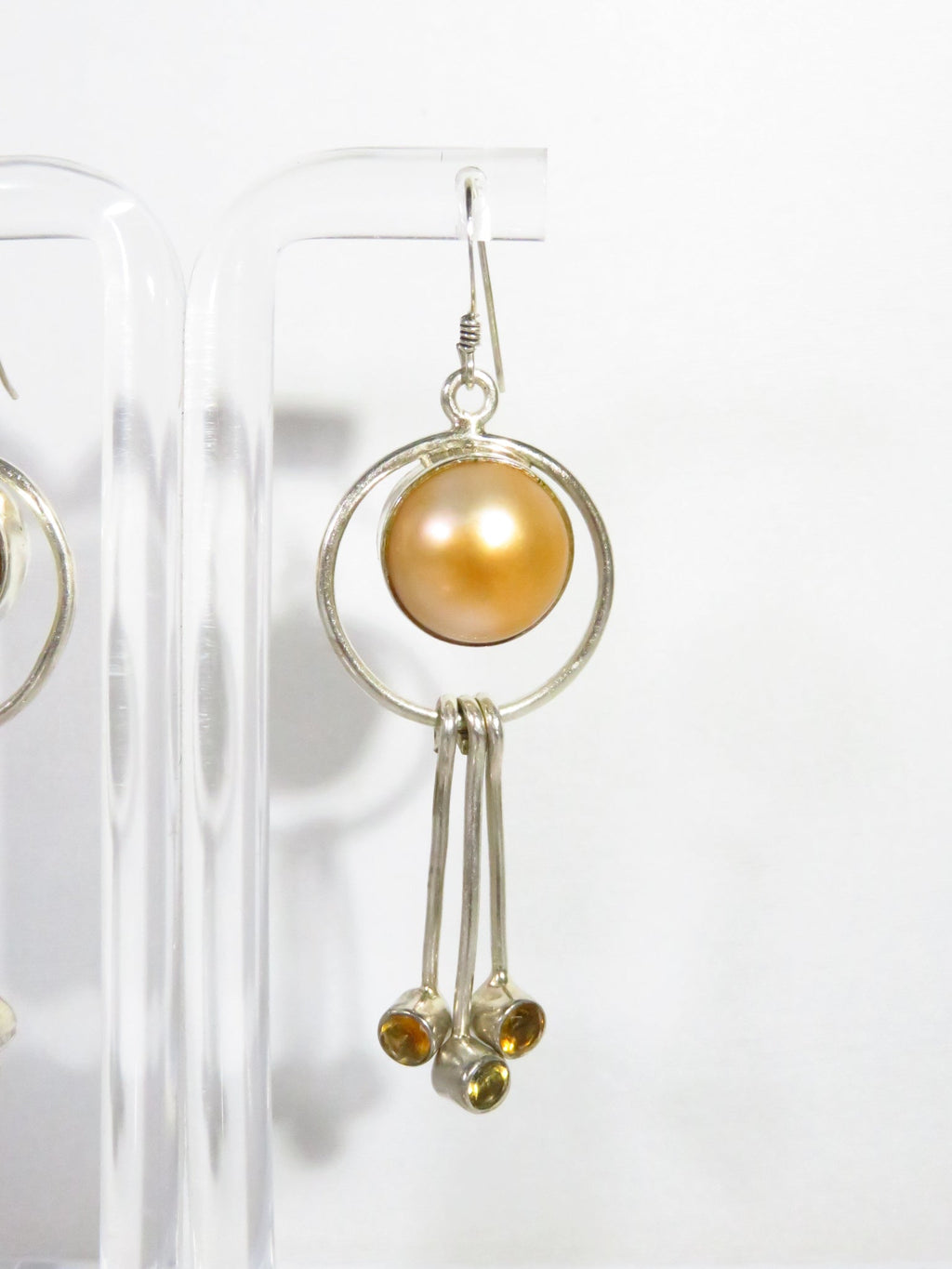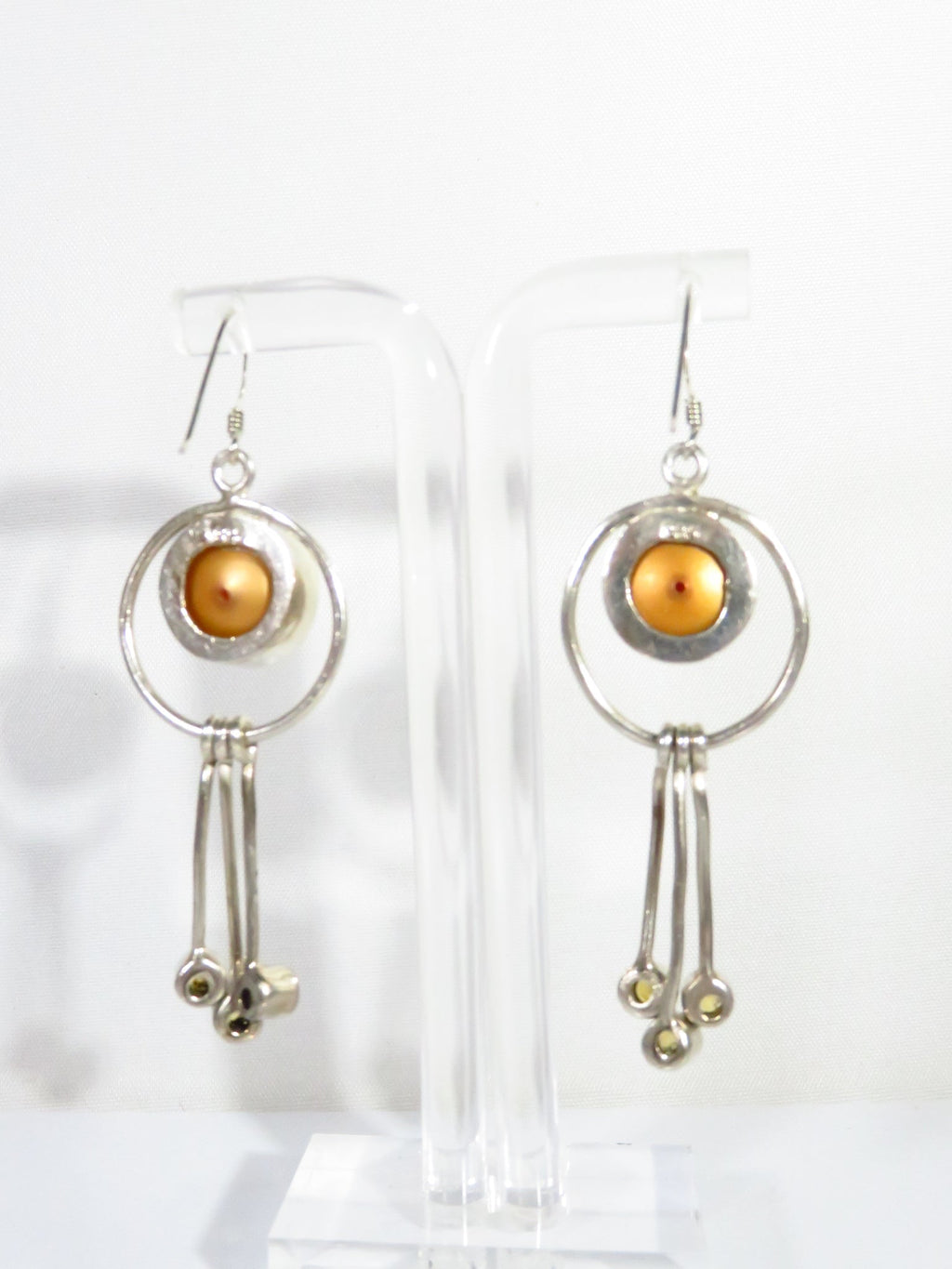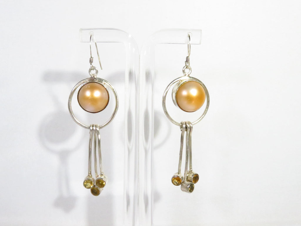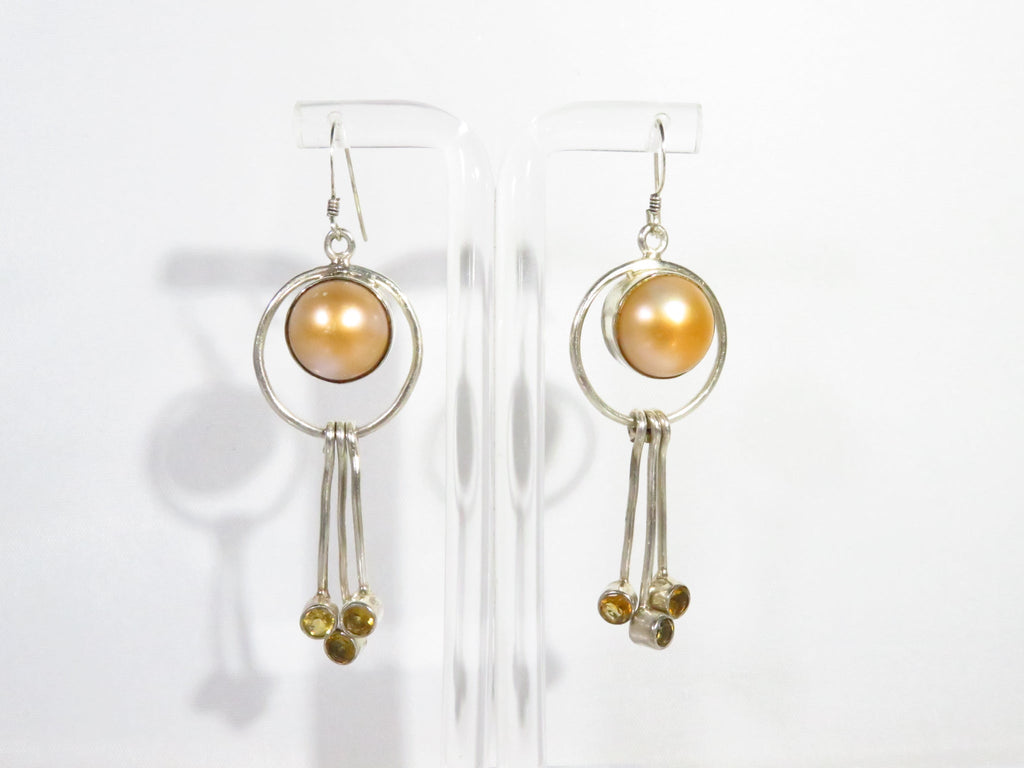 Modernist Pearl Dangling Earring Set Colored Glass Stones Sterling Silver