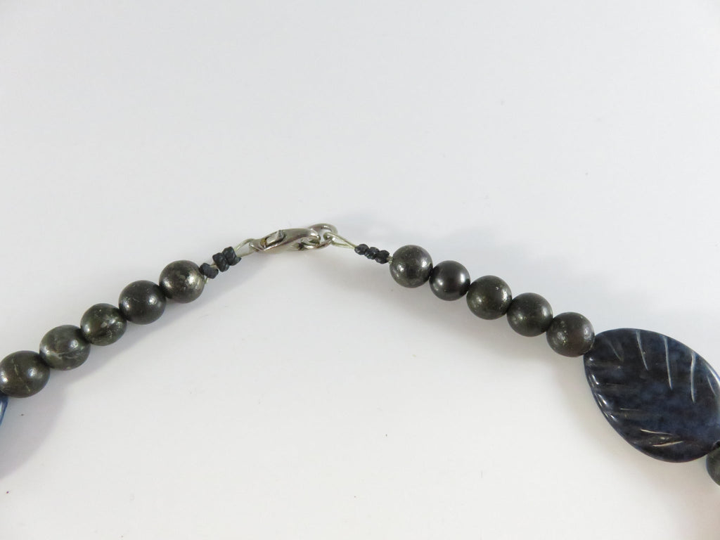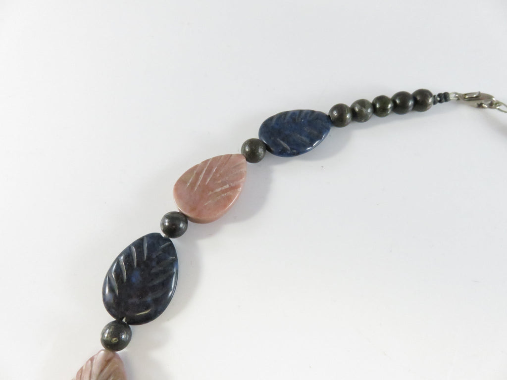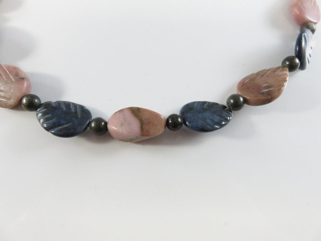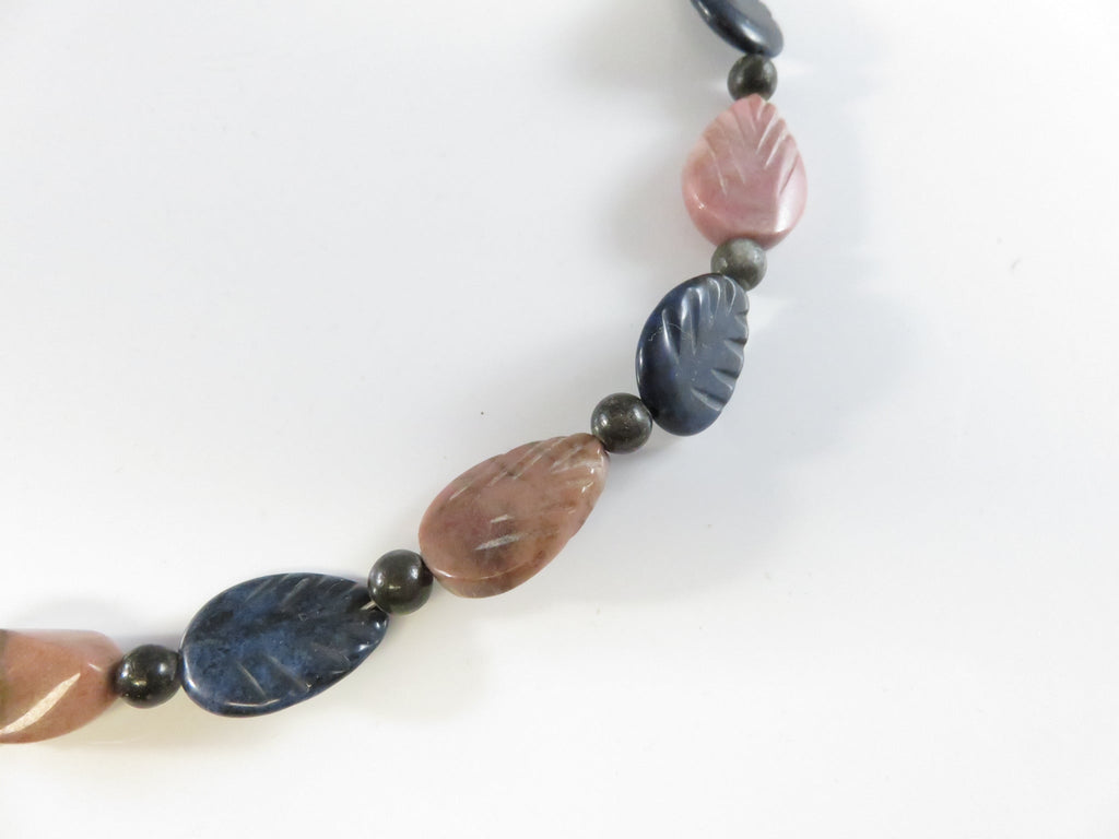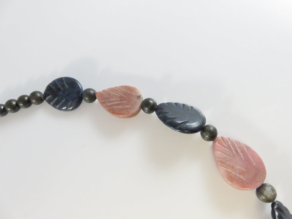 Pink Blue Polished Stone Necklace, Leaf & Ball Beads, Abstract Center Stone, Wire Threaded, 19"