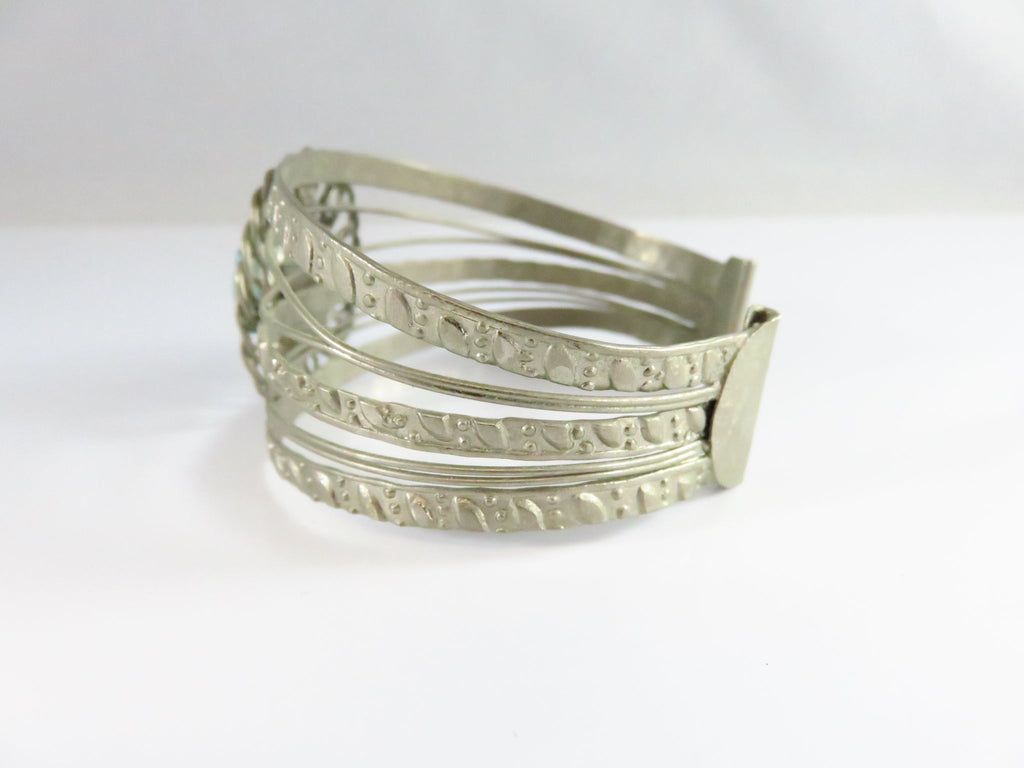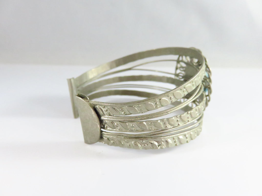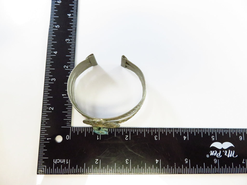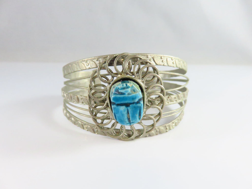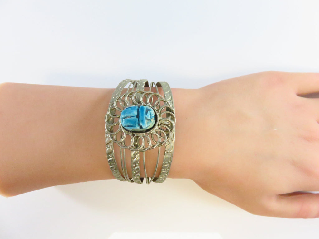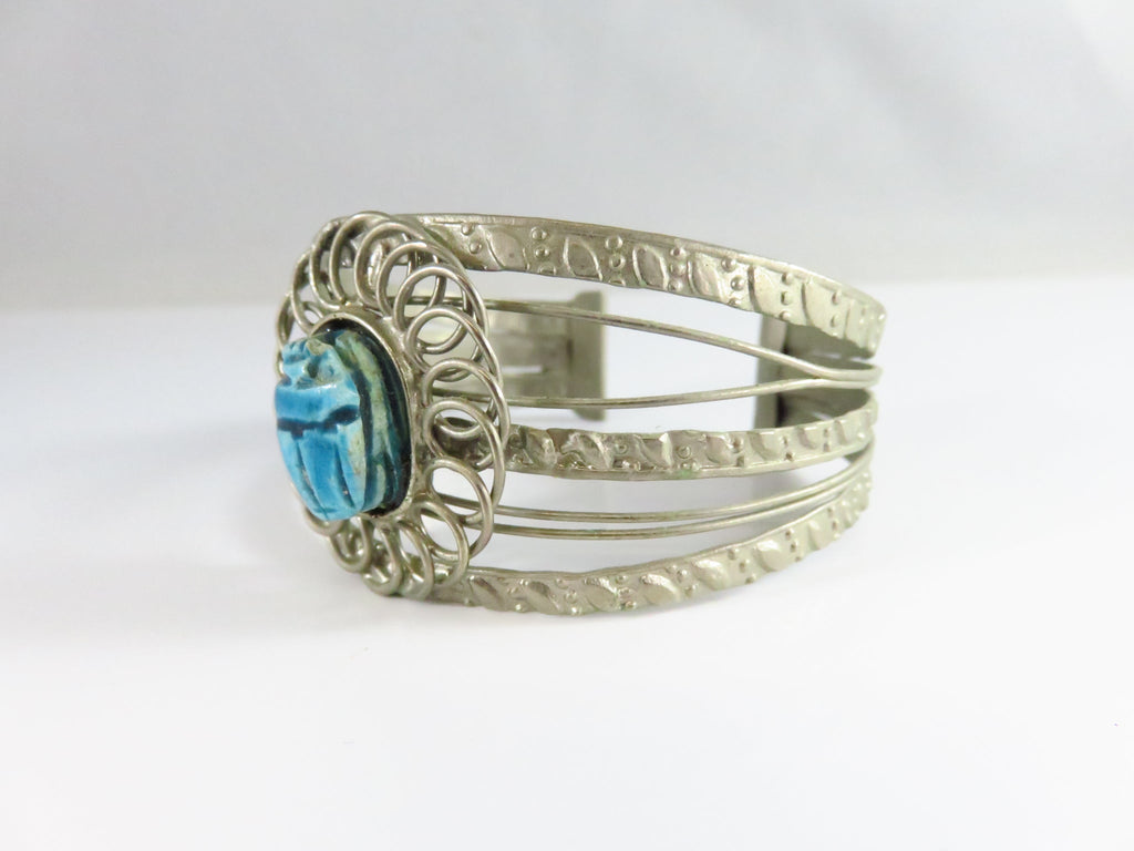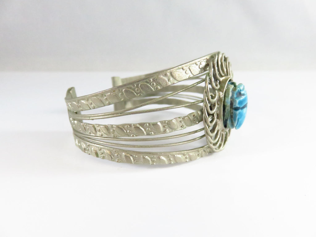 Pre-owned Egyptian Revival Solitaire Scarab White Metal Cuff Bracelet 7 1/4"