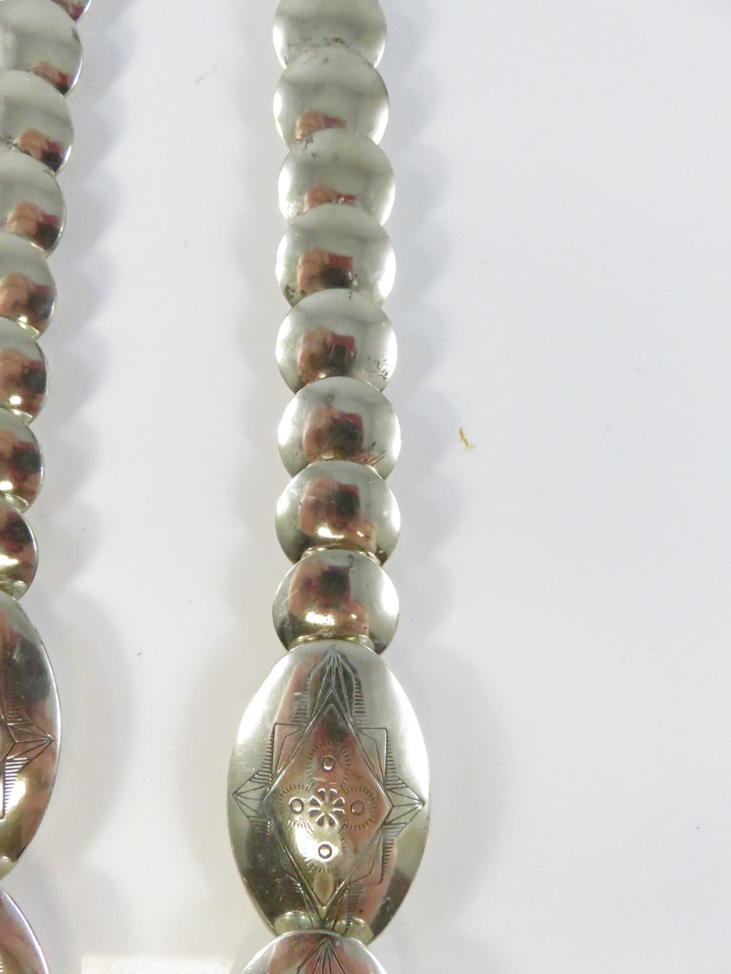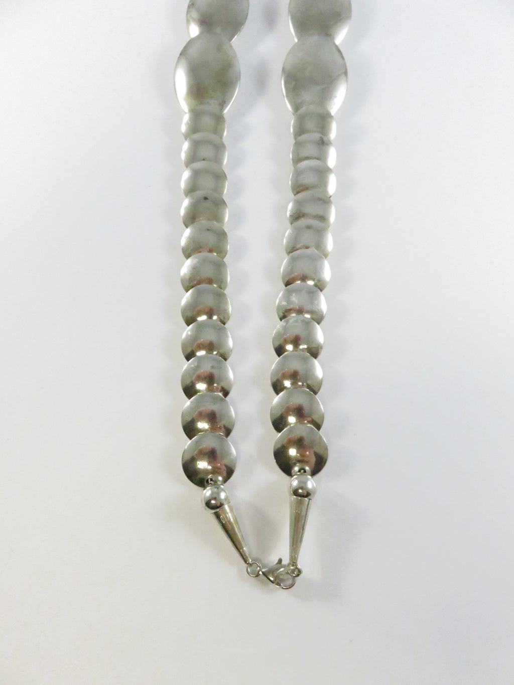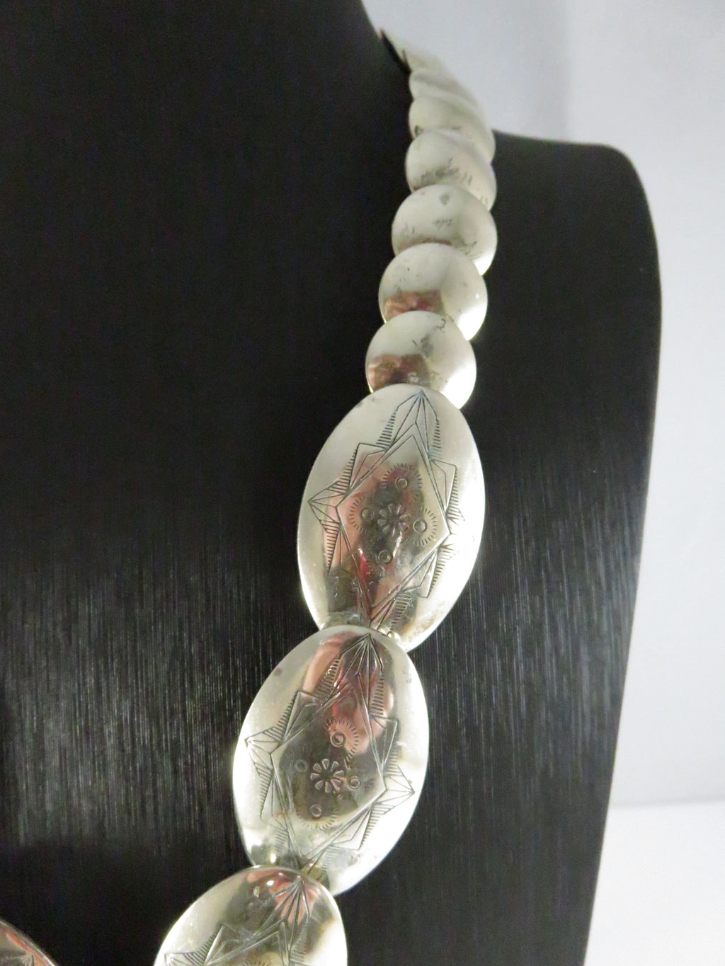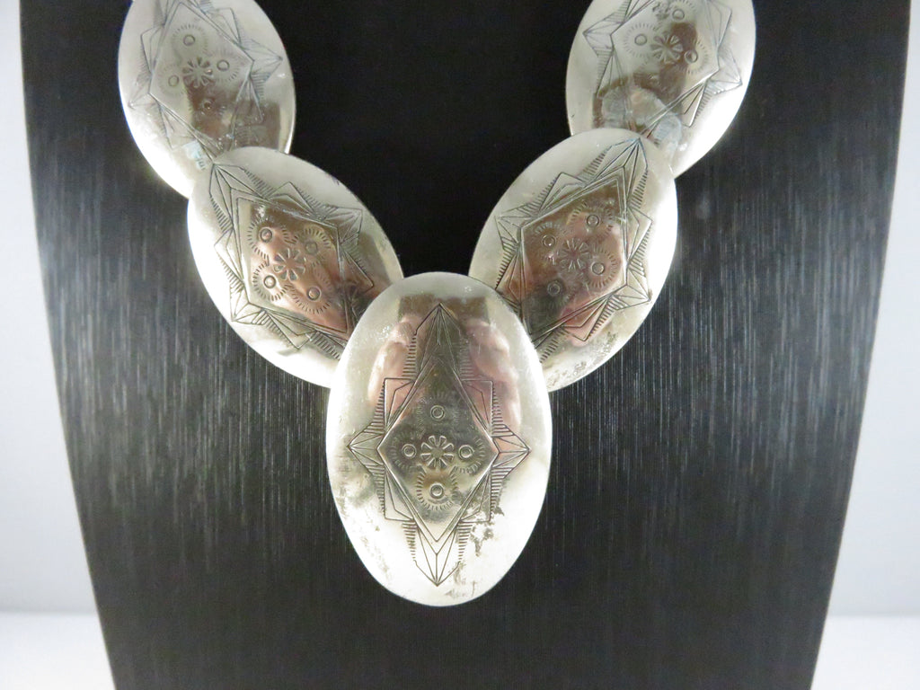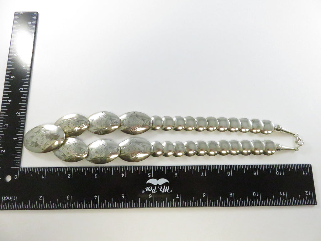 Southwestern Sterling Silver Graduated Pillow Disc Etched Oval Necklace Signed QT Quoc Turquoise 20.25in