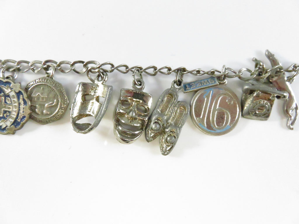 Vintage Mixed Metal Charm Bracelet with Sterling JMF Pieces Sweet 16 Enamel Masks Greyhound 7 Inch