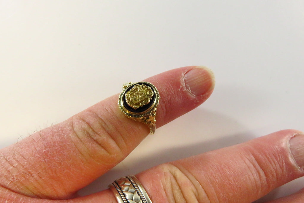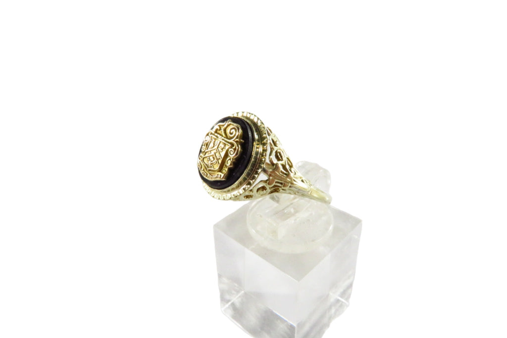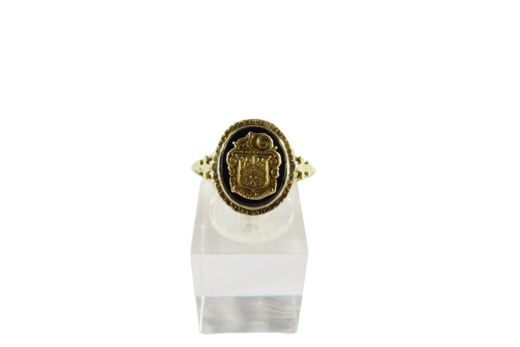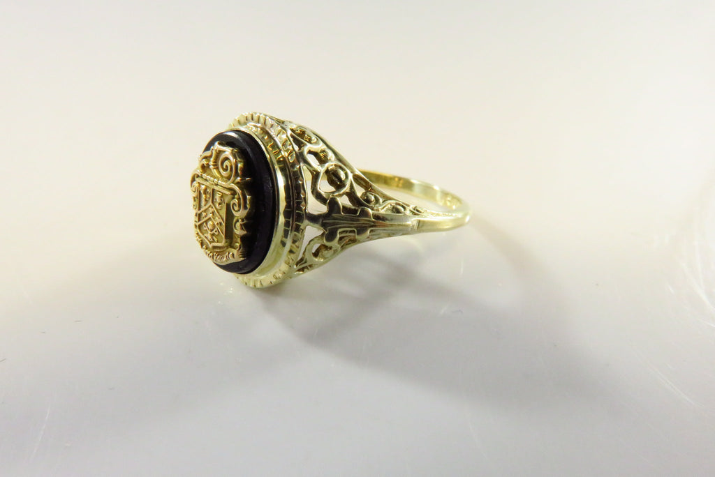 Art Deco 14K Gold Onyx Plaque Crest Ring, Pierced Shoulders, Size 5.75