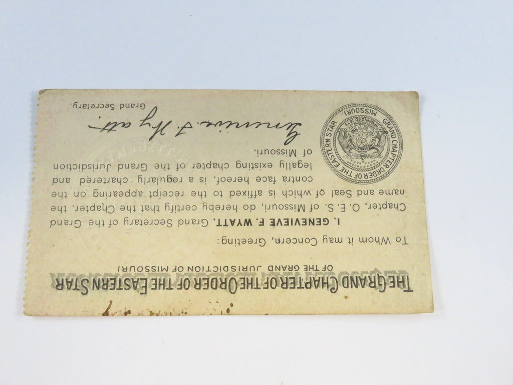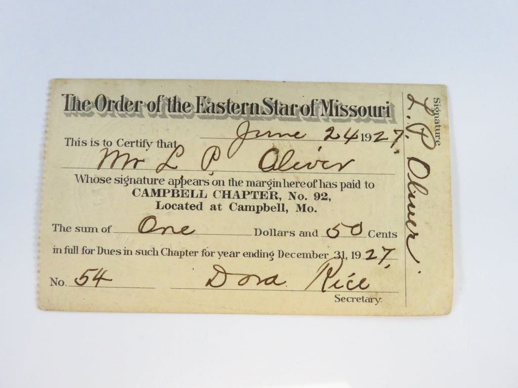 1927 The Order of the Eastern Star of Missouri No92 Campbell MO Lloyd P Oliver Membership Card