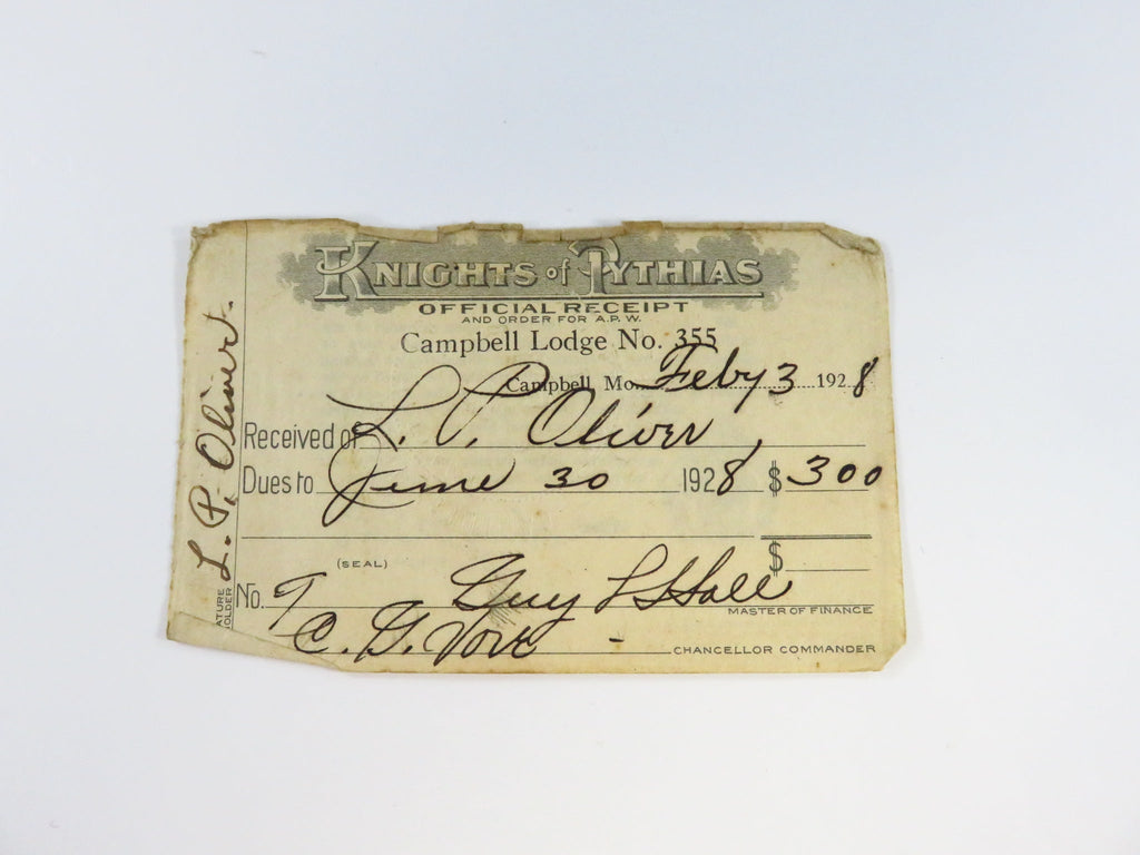 1928 Knights of Pythias Campbell Lodge No 355 MO Lloyd P Oliver Membership Receipt