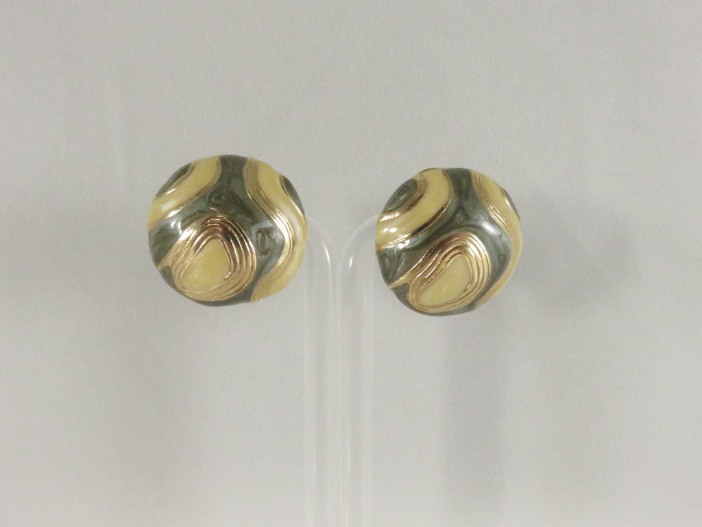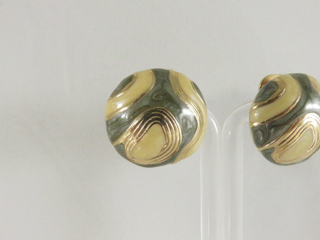 1980s Glitter Round Clips, Gray Cream Enamel Earrings, Unusual Design, 1.12", Gold Tone