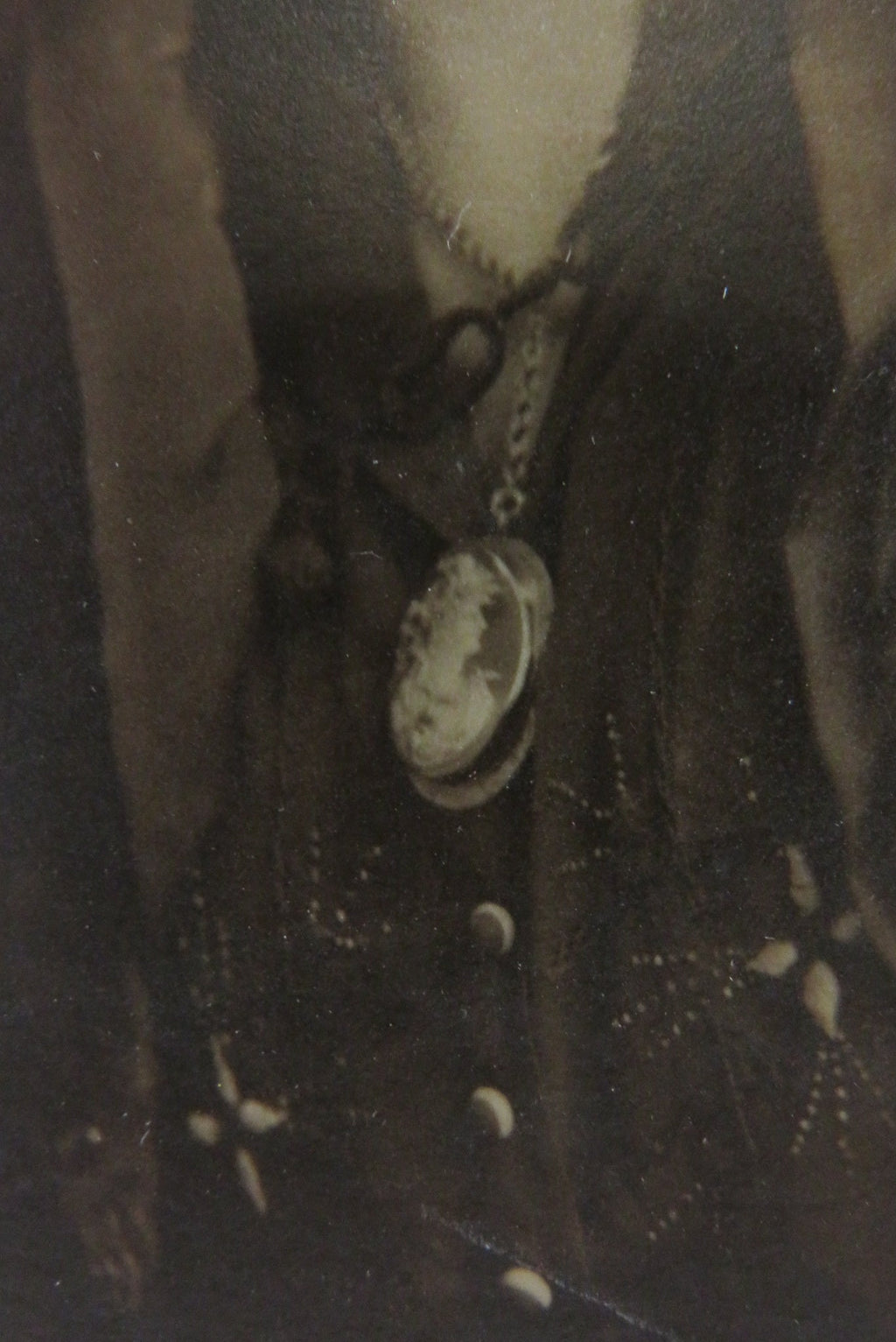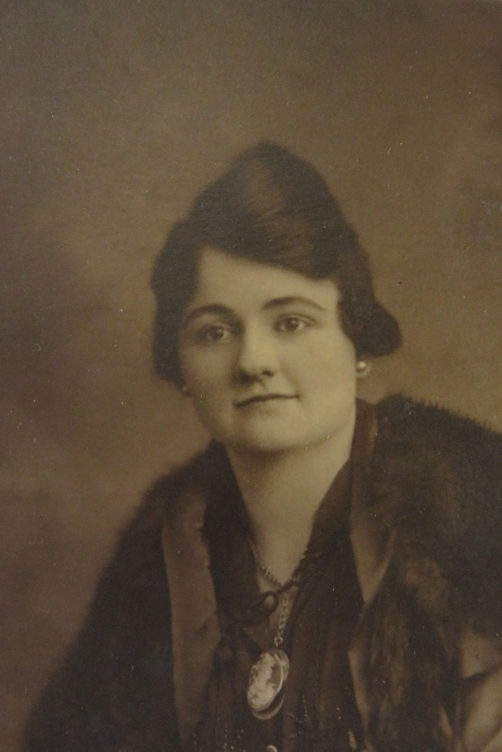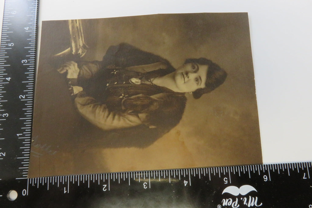 A c1920 Photograph "Dollie" Woman in Fur Coat Huge Cameo Brooch 6" x 4 3/8"