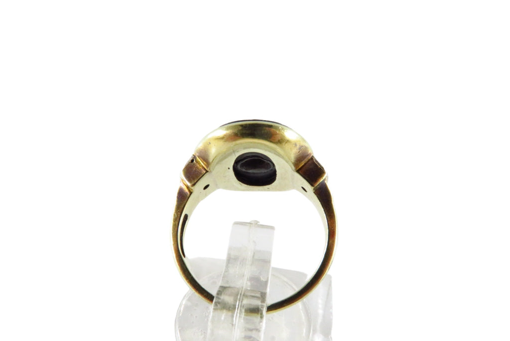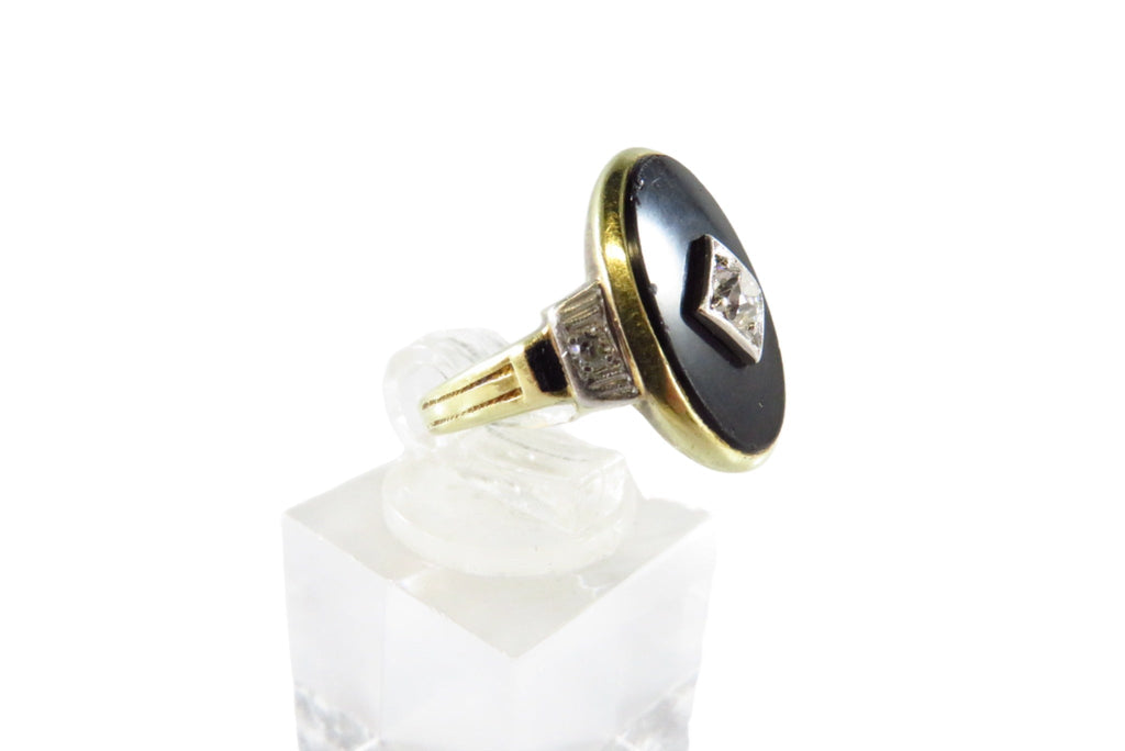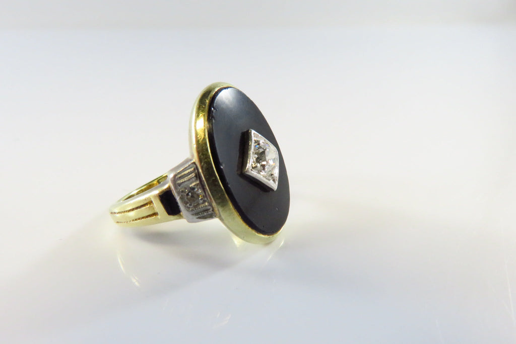Art Deco 14K Gold Black Onyx Plaque Ring with Diamond Size 4
