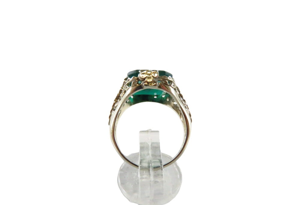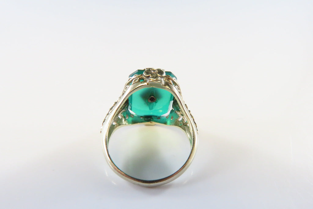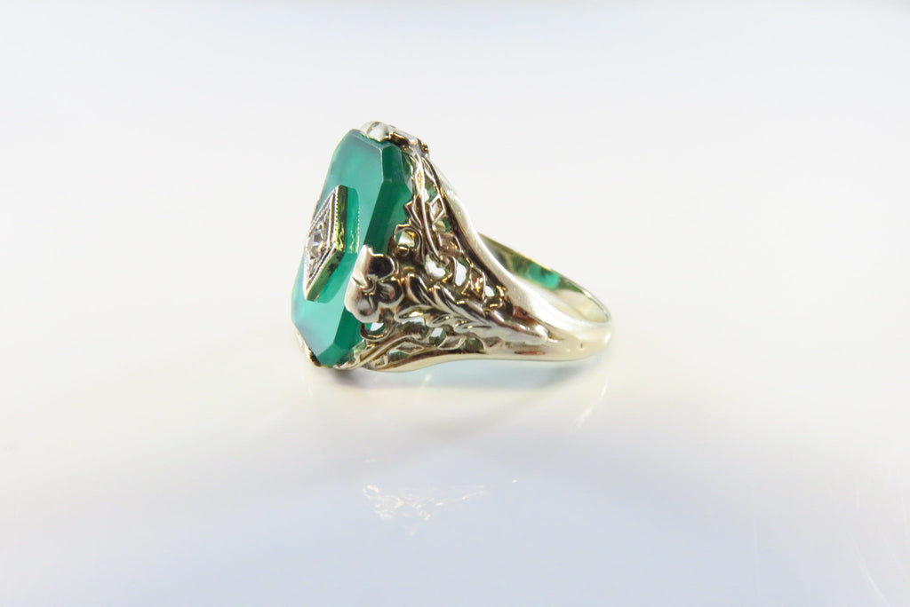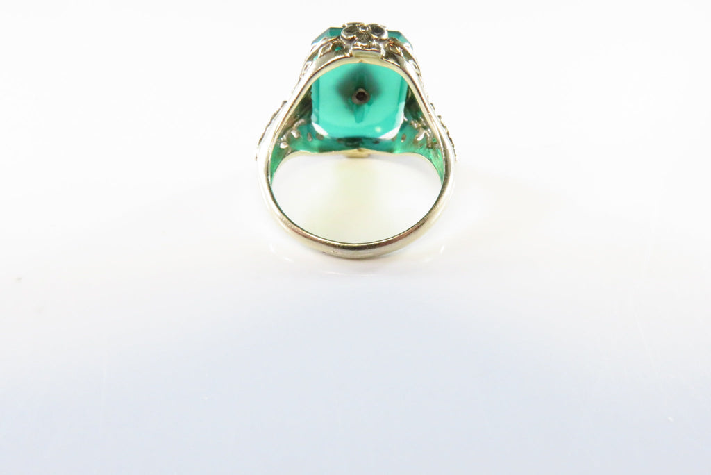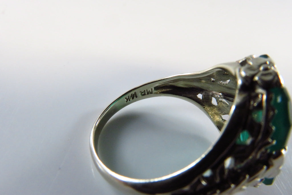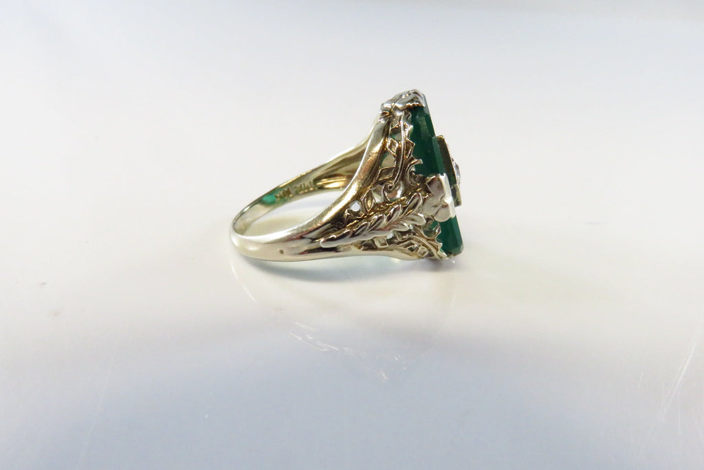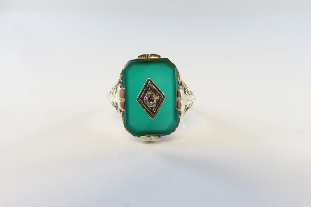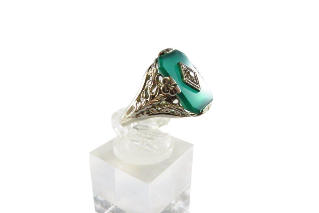 Art Deco 14K White Gold Chrysoprase Plaque Ring with Diamond Accent, Size 4.75