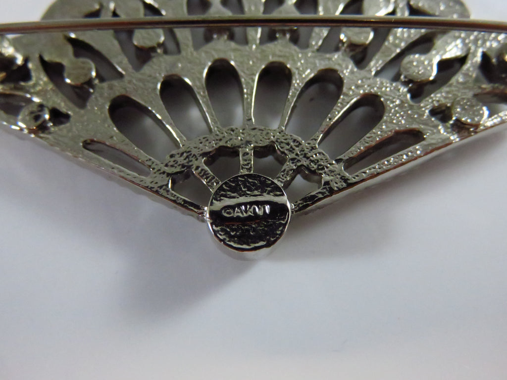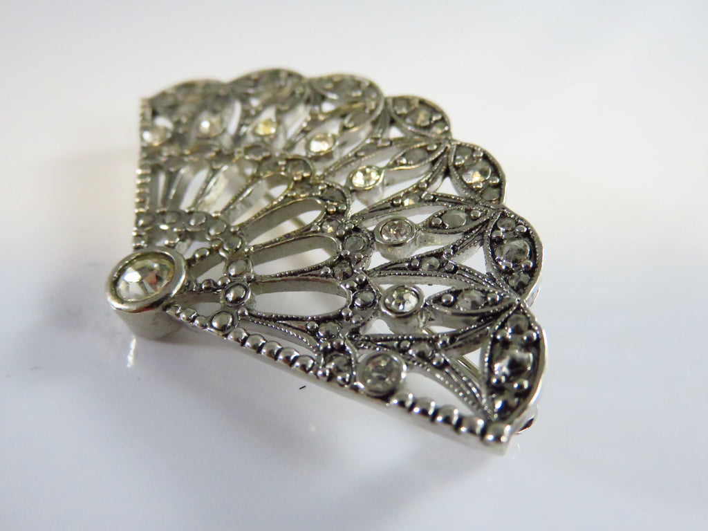 Art Deco Style Fan Brooch White Metal Clear Stones By Avon 2 1/4" Wide