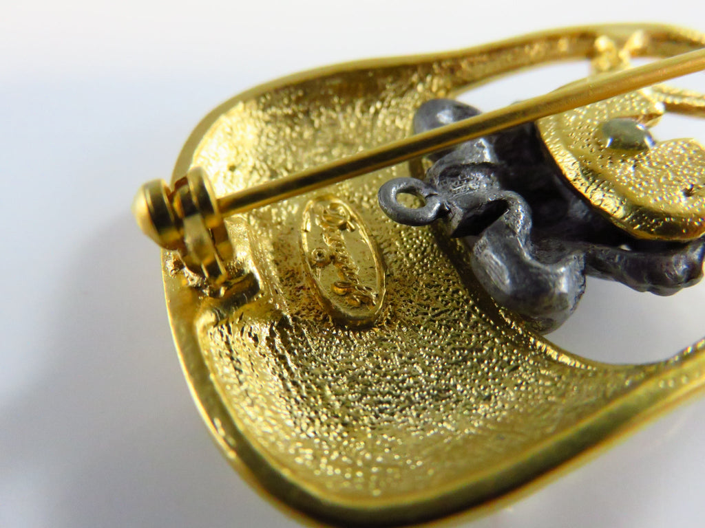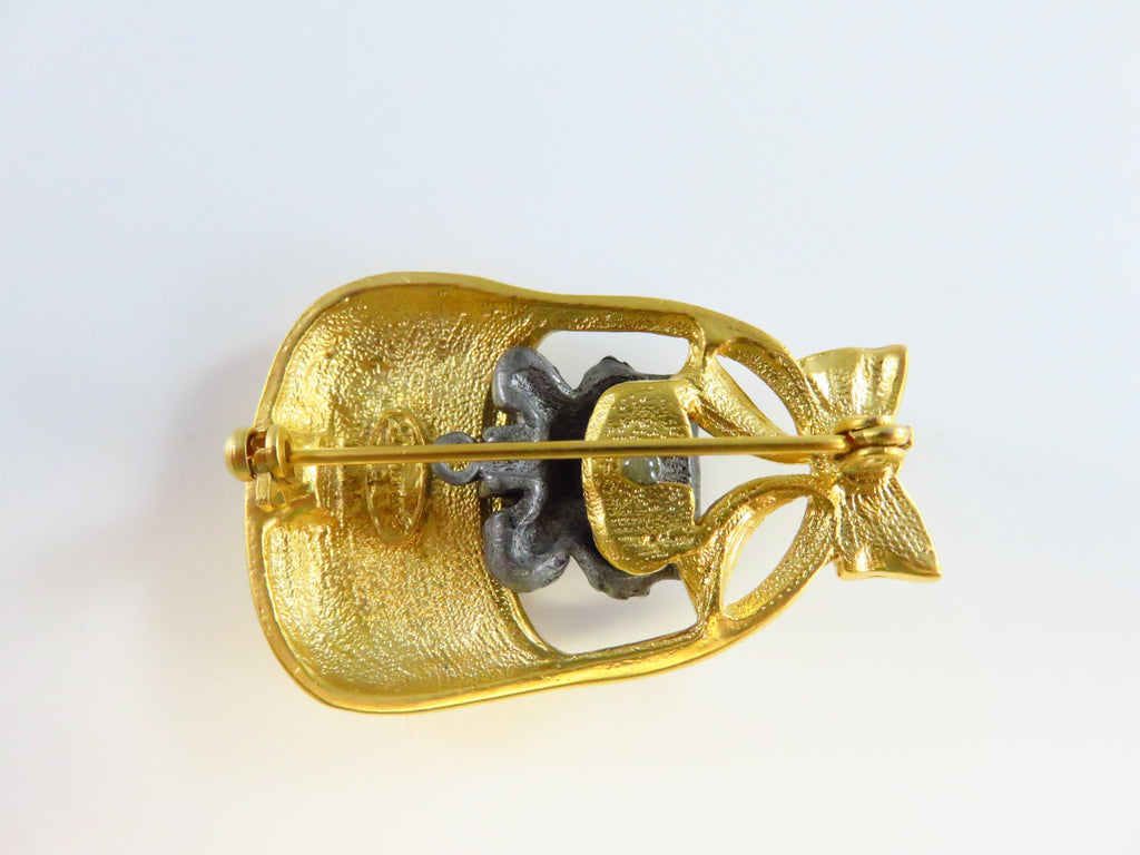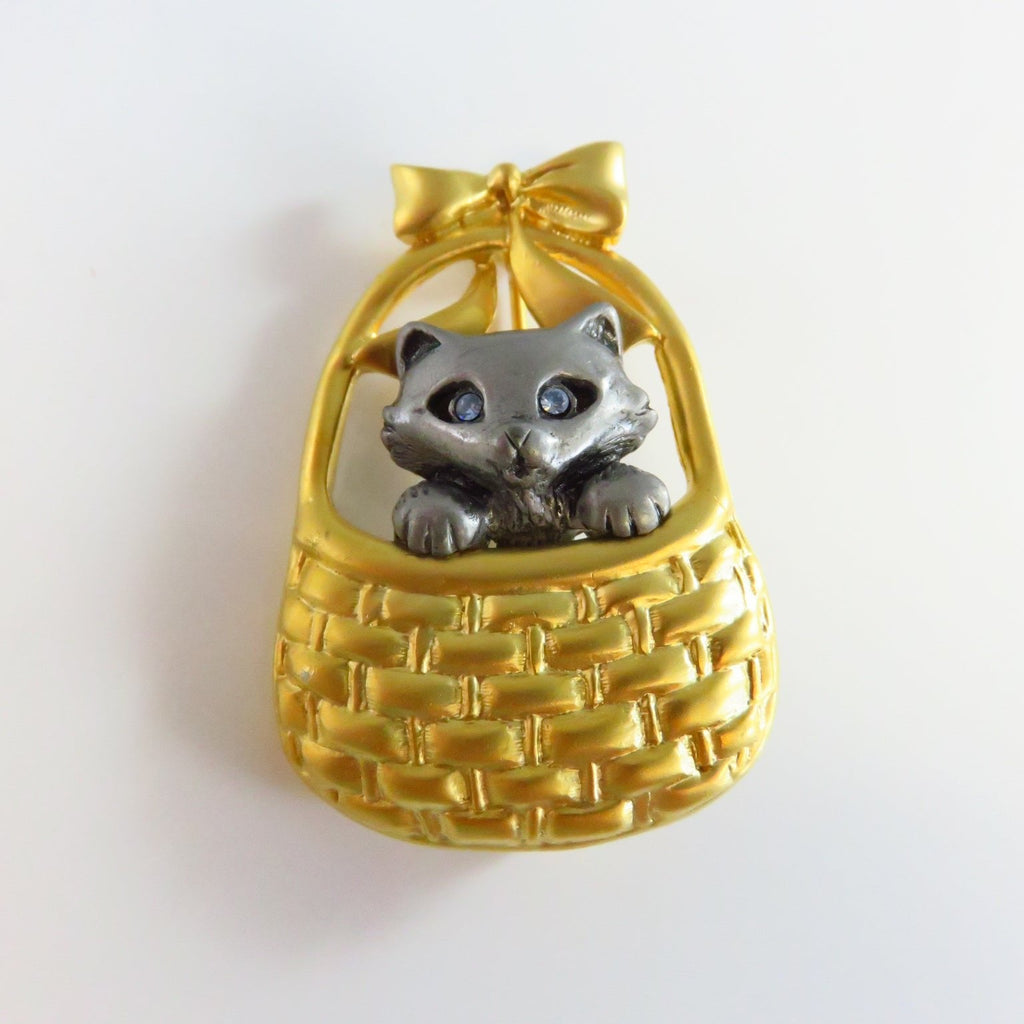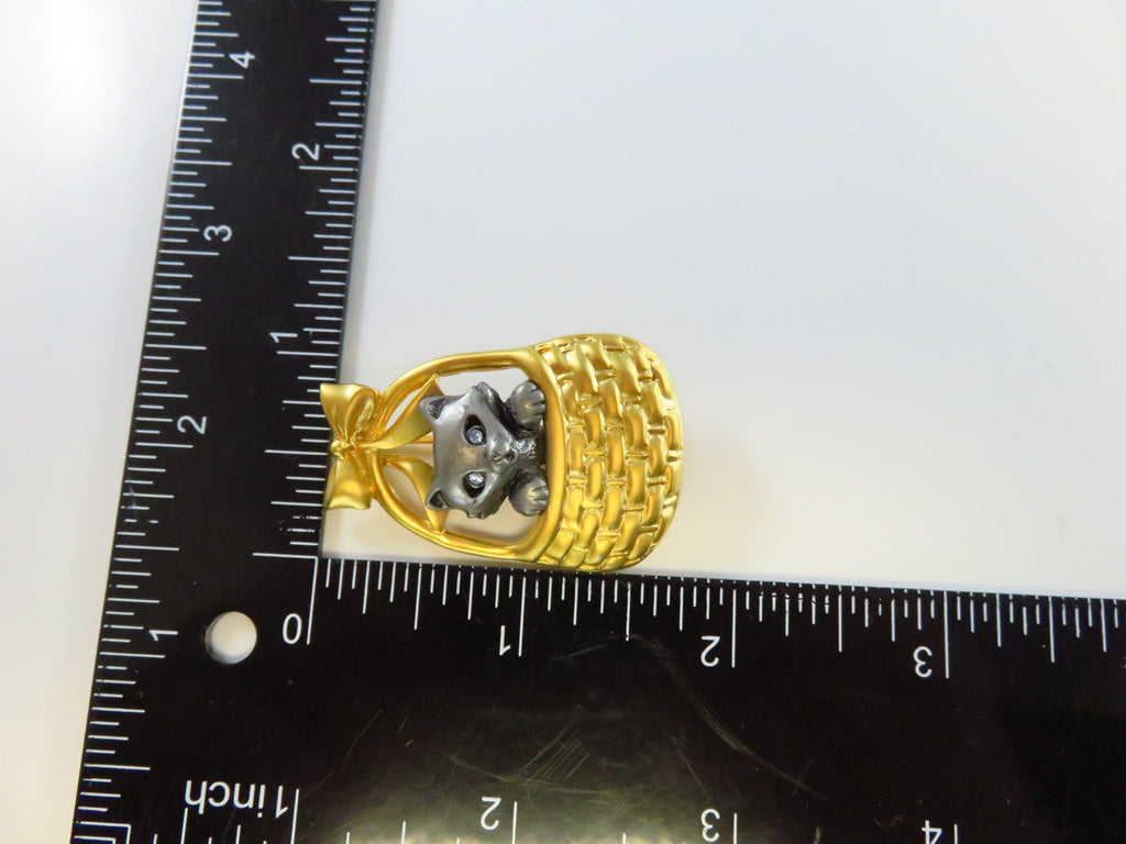 Blue Eyed Gray Kitten in Gilded Wicker Basket with Bow Brooch 1 3/4"