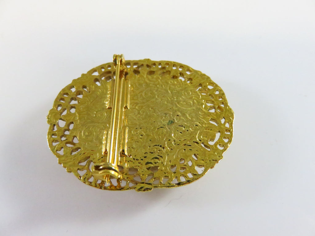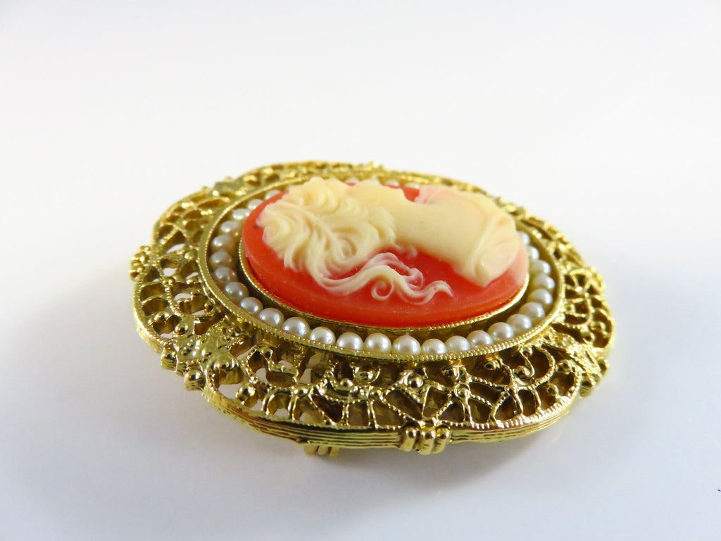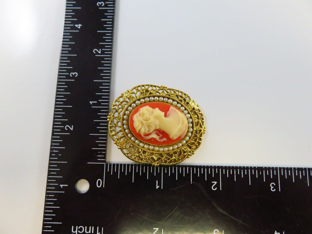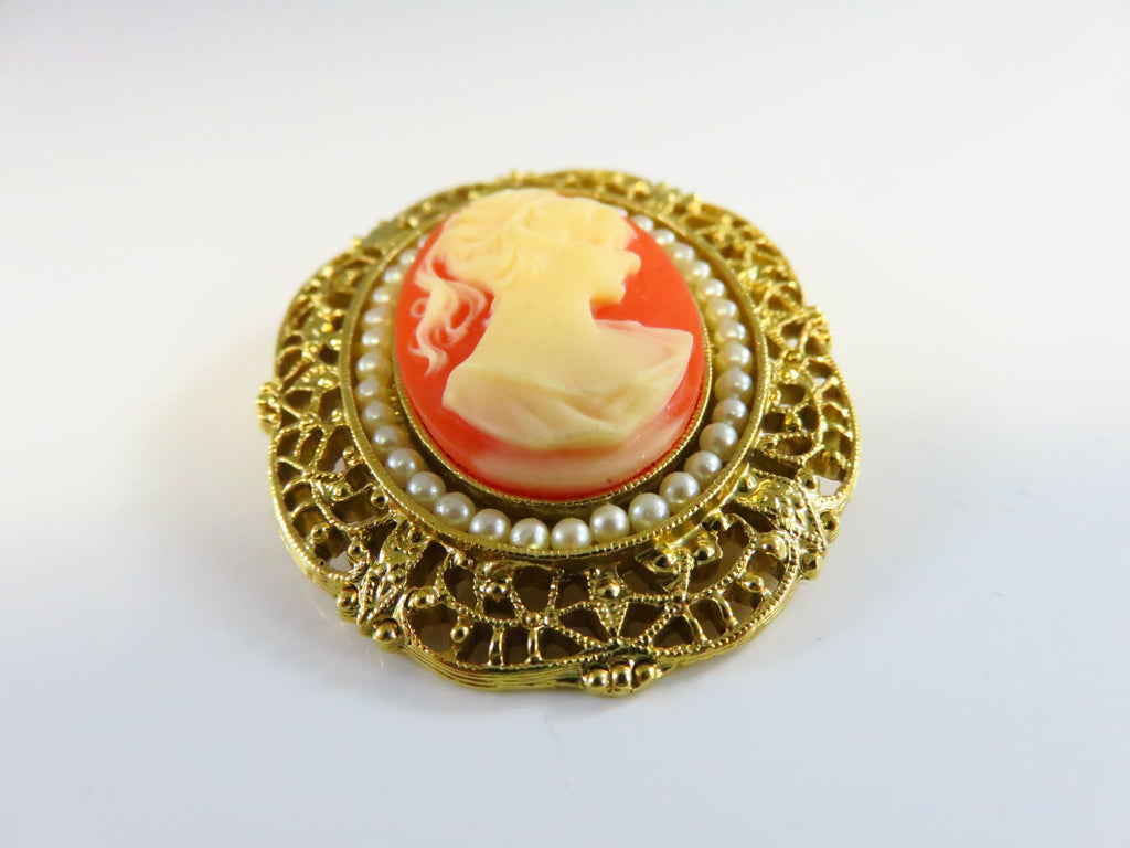 Cameo Brooch Pearl Surround Pierced Gilded Frame Celluloid Cameo
