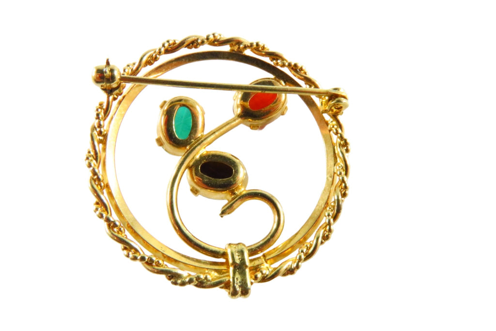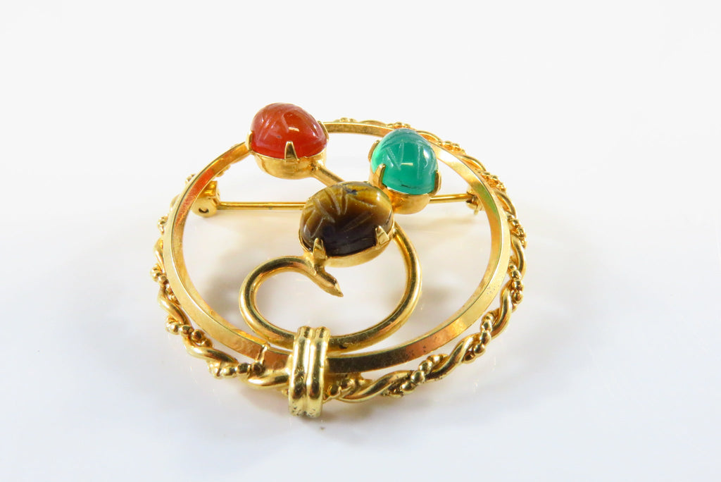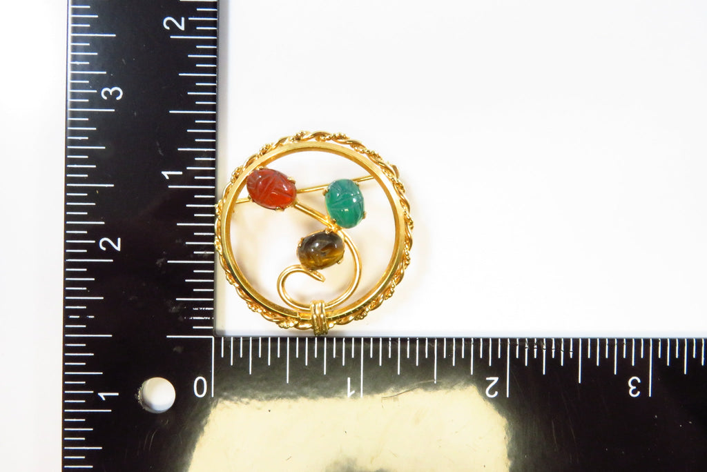 Egyptian Revival Round Swirling Scarab Brooch Orange, Green and Brown Scarabs