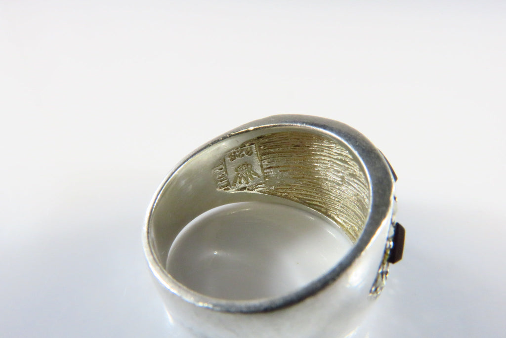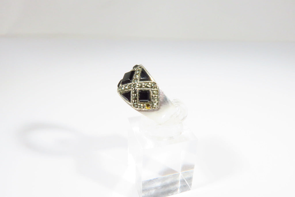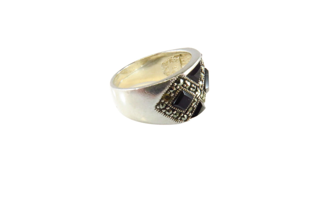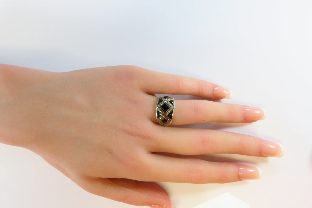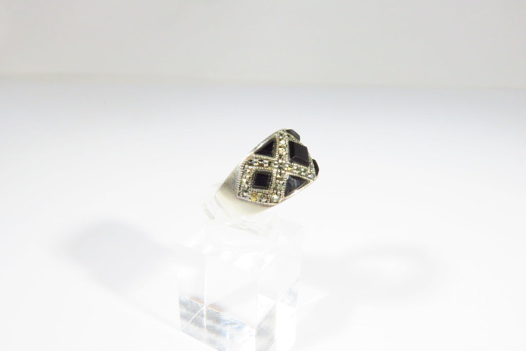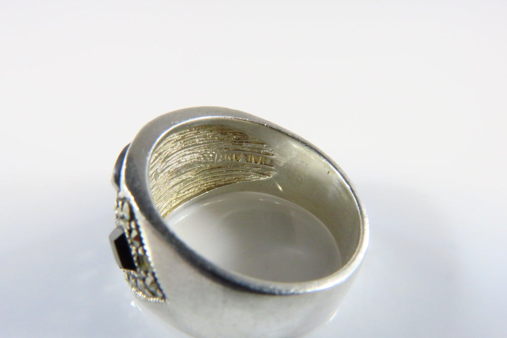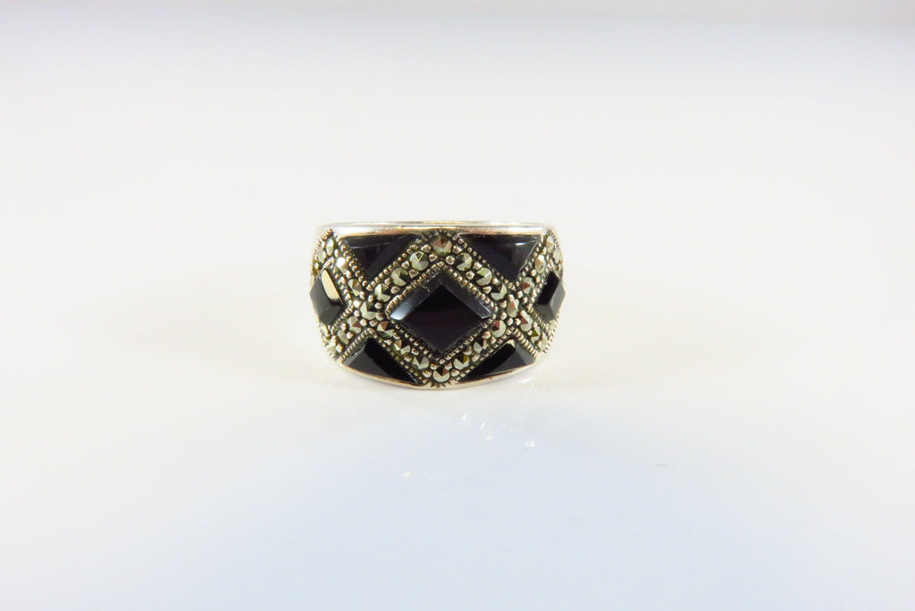 Fashionable Onyx & Marcasite Accented Sterling Silver Band Ring Size 5 3/4